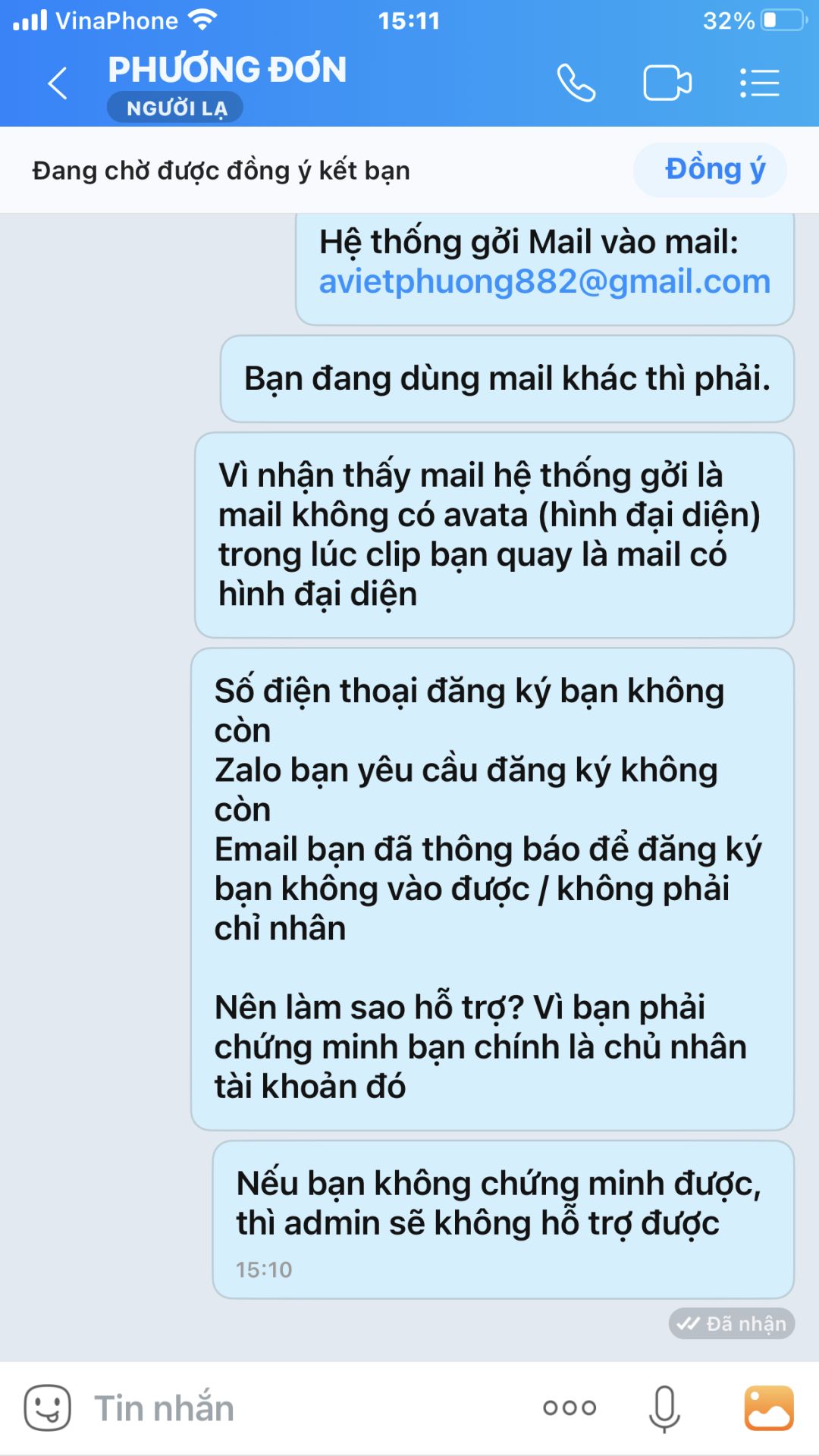 Vì vậy Admin đã từ chối hỗ trợ thông tin qua tài khoản không chính danh.