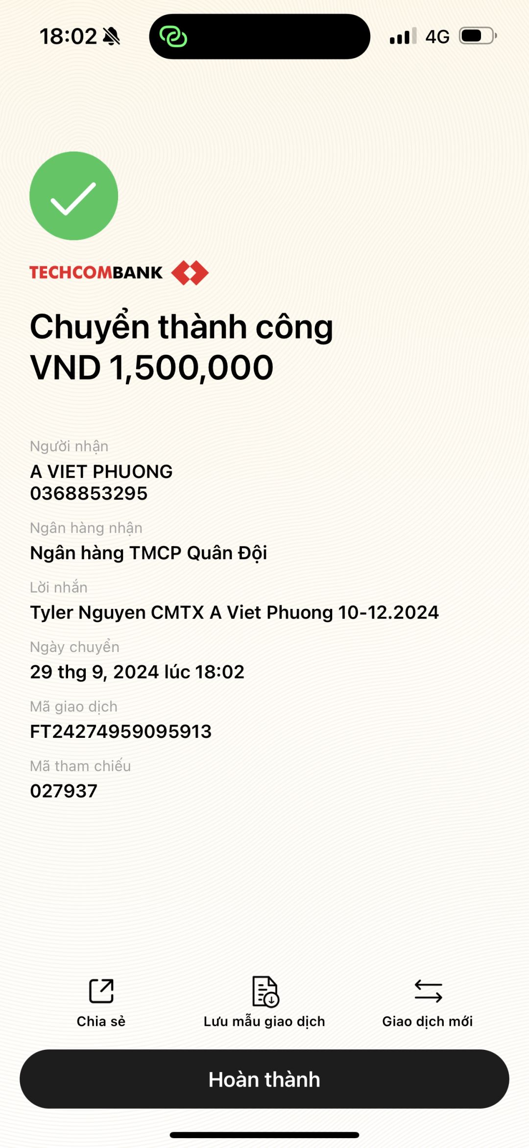 Anh Tyler Nguyen chuyển tiền CMTX cả quý 4/2024 (10-12/2024). Chúc anh bình an nhé!
