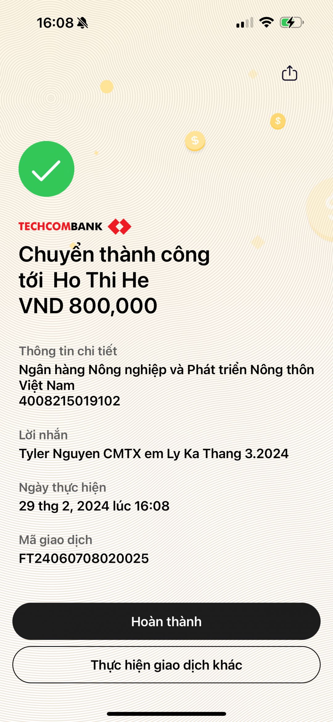 Chào các mảnh thường quần! Em  là Hồ Thị Hè đã nhận được tiền CMTX tháng 3/2024 là 800 nghìn đồng. Em cảm ơn anh Tyler Nguyễn nhiều ạ.