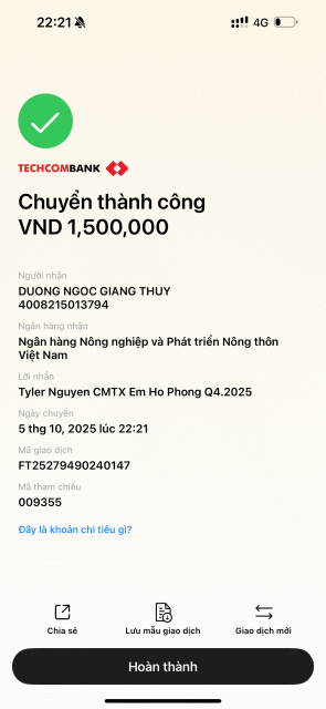 Chú Tyler Nguyen tiếp tục giúp đỡ cháu. Số tiền CMTX Q3/2025 đã được chuyển khoản.