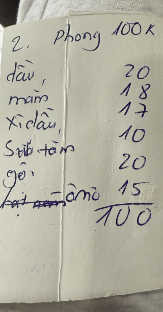 400. 000 đ thực phẩm( gia vị 100.000đ, cá 100.000 đ, khuyết 50.000 đ,trứng :100.000đ, mì 50. 000đ ) 100.000 đ tiền mặt
