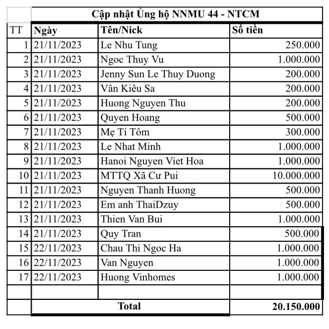 Cập nhật số tiền ủng hộ NNMU số 44 đến thời điểm hiện tại là 20.150.000