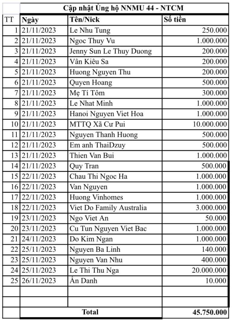 Cập nhật số tiền ủng hộ NNMU số 44 đến thời điểm hiện tại là 45.750.000