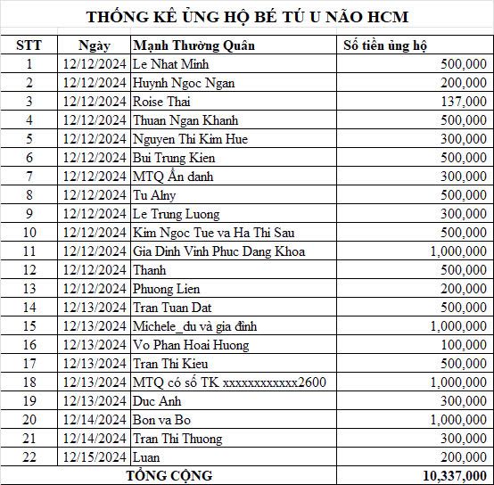 Tổng kết các khoản ủng hộ cho bé Tú, tổng cộng là 10,337,000đ. Chúng ta đã chuyển 5,000,000đ.