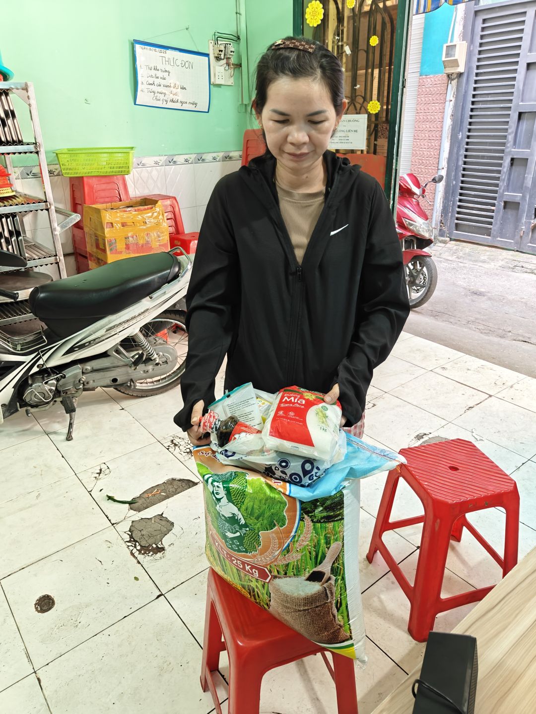 Tháng vừa rồi, bé Tú phải nhập viện để làm phẫu thuật lại nên gia đình chưa ghé lấy nhu yếu phẩm được. Tuần rồi, mẹ của bé đã ghé quán cơm để nhận gạo & nhu yếu phẩm của tháng 4 và 5.