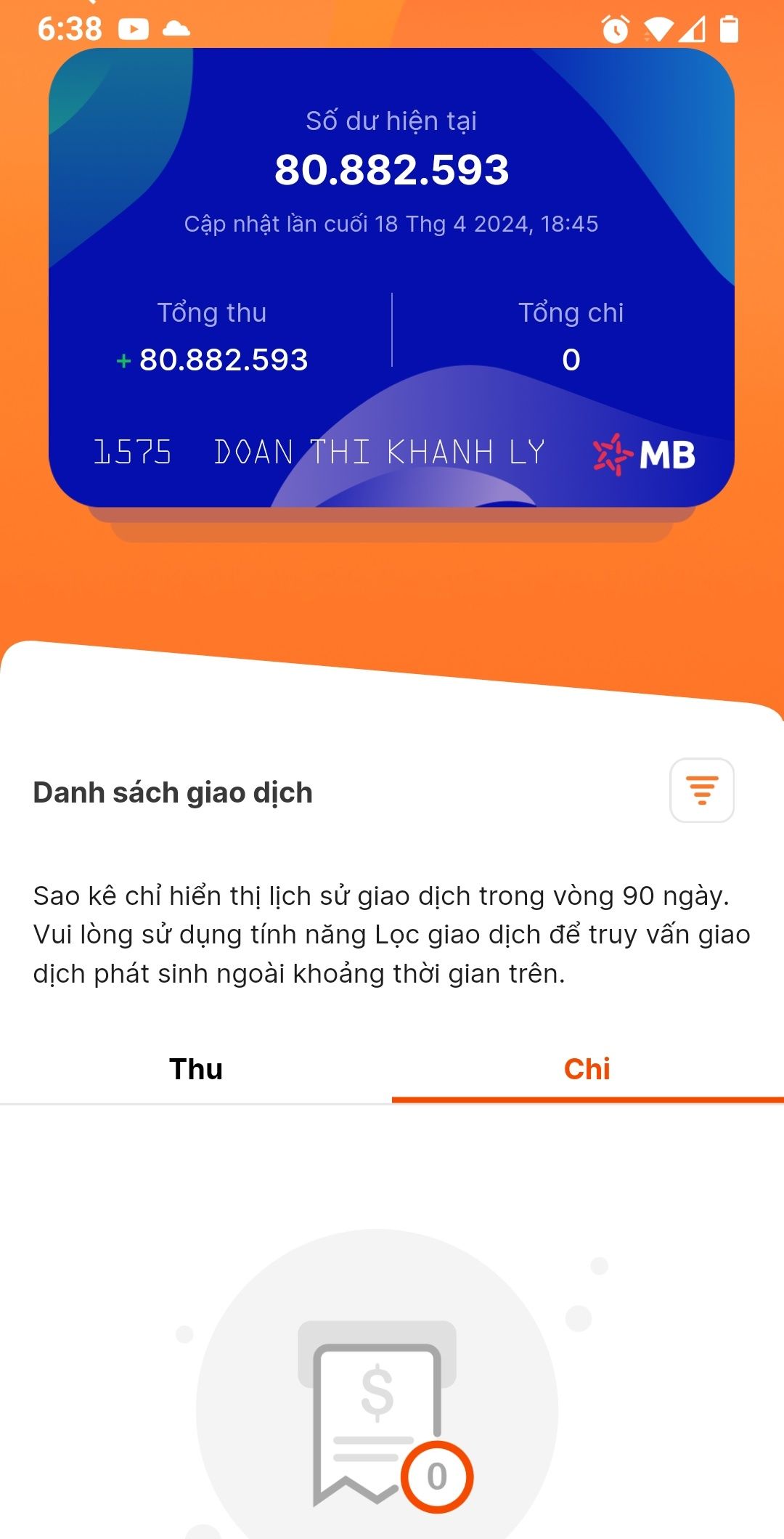 * Xem hoạt động Thu - Chi của tài khoản 1575 MB Bank trên App Thiện Nguyện không thể hiện khoản Chi nào cho tới thời điểm hiện tại ( các bạn xem