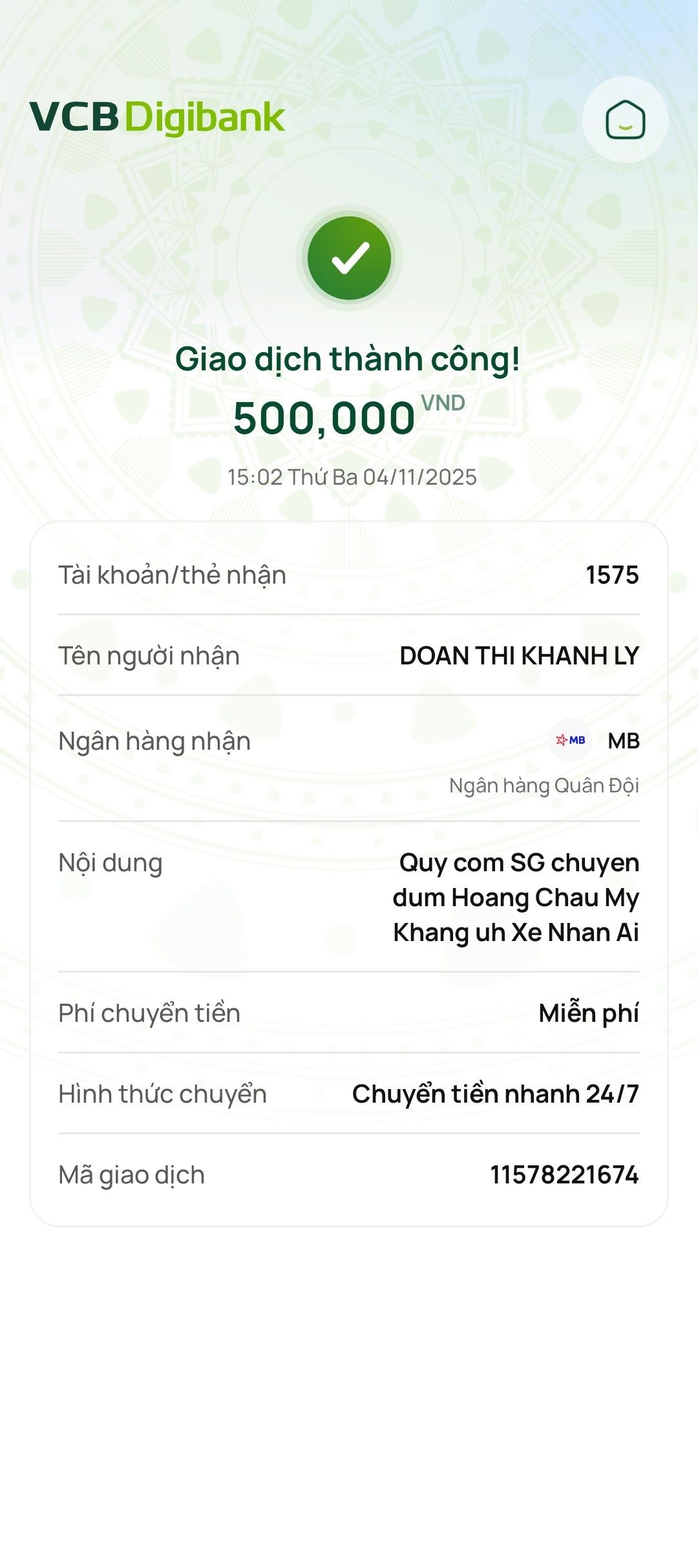 Thủ quỹ đã Ck đến Giang số tiền 770.000vnd Chuyến  xe nhân ái TH0125.