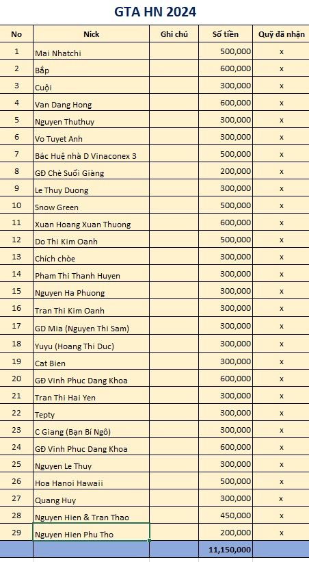- Mọi đóng góp xin gửi về tài khoản NTCM số 1501 - MB Bank Hoàng Thị Quỳnh Trang; Xin vui lòng ghi rõ theo cú pháp “Anh/chi ung ho GTA HN 2024”