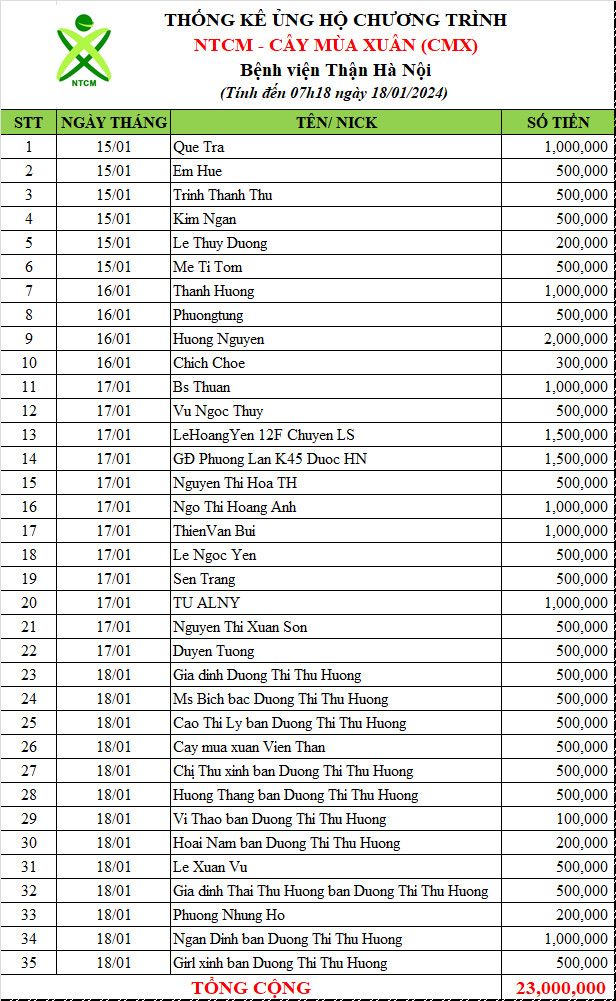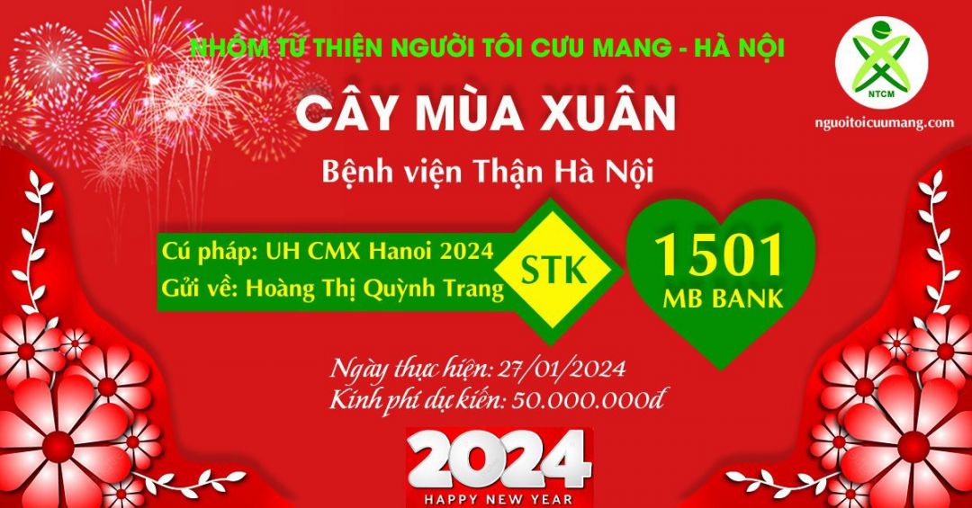 📣📣📣Nhân dịp Sinh Nhật Người tôi cưu mang, cũng là dịp Tết đến, với mong muốn được chia sẻ và động viên với người bệnh tại nơi đây,  NTCM xin phát động Chương trình Cây Mùa Xuân - tặng BN Bệnh viện thận vào ngày 27/1/2024 với 200 suất quà trị giá 50 triệu đồng
