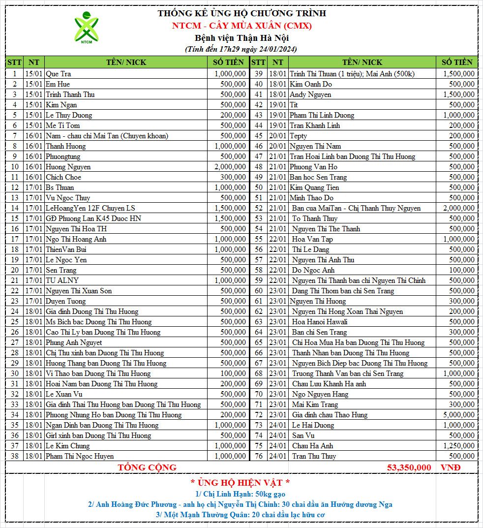 (Trong đó: Quỹ chương trình CMX đã nhận 54.350.000 VNĐ từ quỹ NTCM ngày 25/01/2024. Hiện còn dư: 6.510.000 VNĐ)