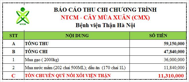 Số tiền dư của Chương trình theo đề xuất của Thái Duy và một số thành viên. Mai tân thống nhất xin chuyển vào TK 5064 của Nồi Xôi để tiếp tục thực hiện Chương trình Thứ Bảy yêu thương tại Viện thận