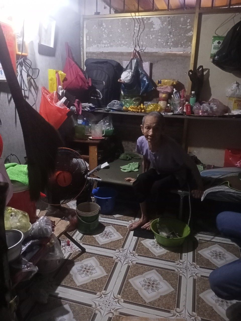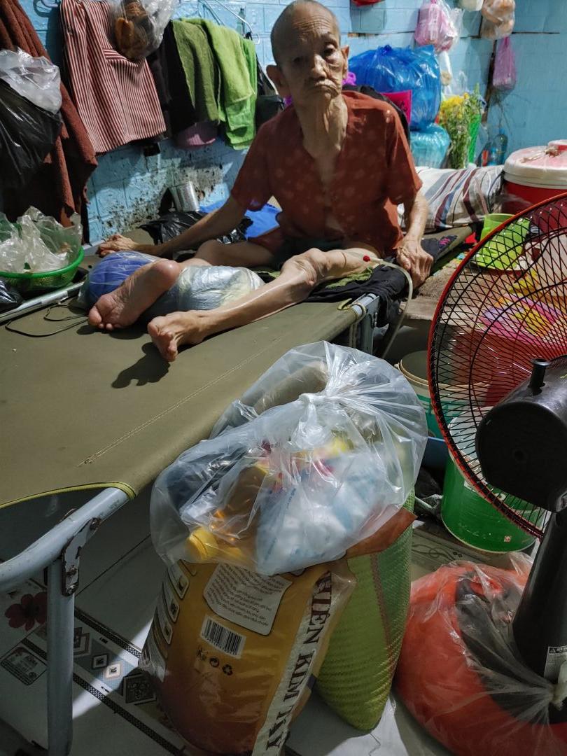 Lúc chuyển qua nhà trọ mới, không may bà bị té gãy chân, nên giờ bà không đi lại được, chỉ nằm 1 chỗ, sức khỏe già yếu nên cũng không thể phẫu thuật bó xương lại được.