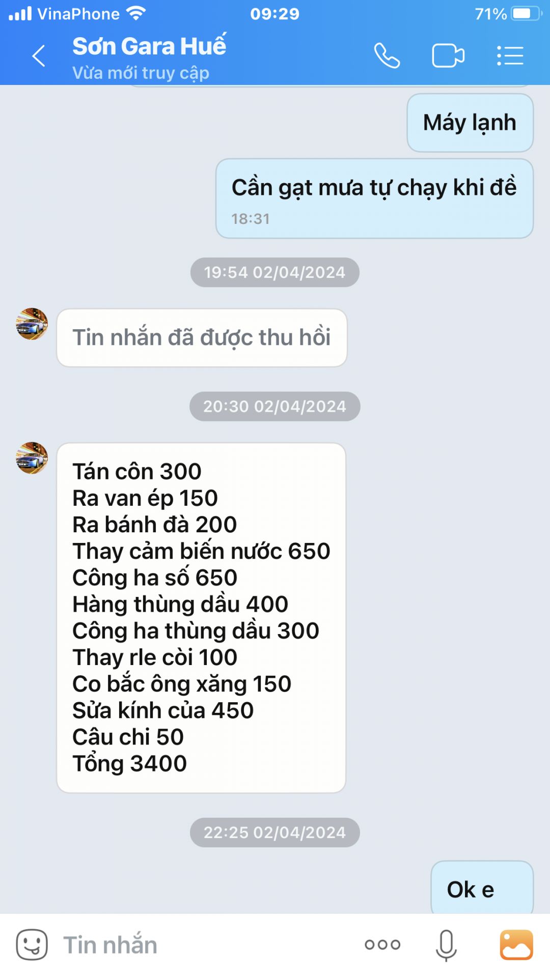 Ga ra đã sửa theo yêu cầu đề nghị của anh Phúc trong chuyến xe trươc( tháng 3 thì phải). Anh Phúc tranh thủ nghiệm thu để thanh toán cho ga ra anh ơi!