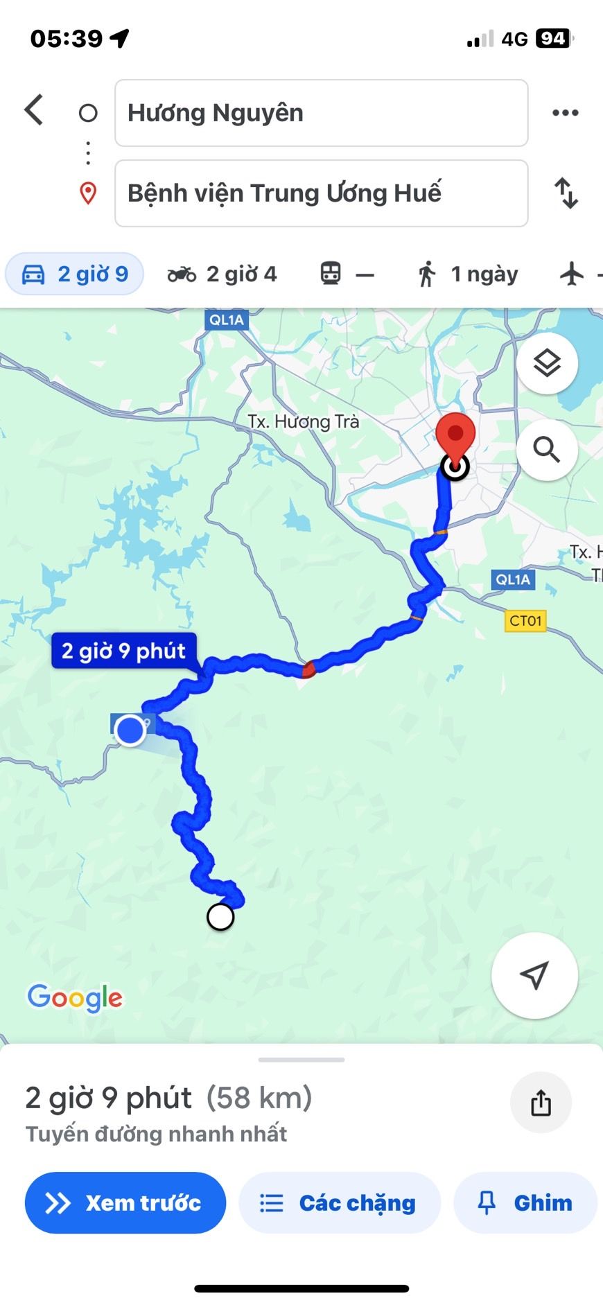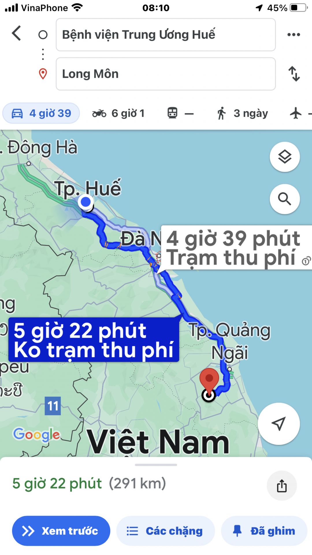 Nhận bệnh lúc 11h30. Dự trù trả bệnh lúc 17h - đi toàn tuyến cao tốc hết lộ trình Huế Quãng Ngãi; rồi ngược lên phía Tây qua đèo eo gió và đèo Long Môn; nhưng lộ trình thay đổi vì cấp cứu bệnh nhân giữa đường.