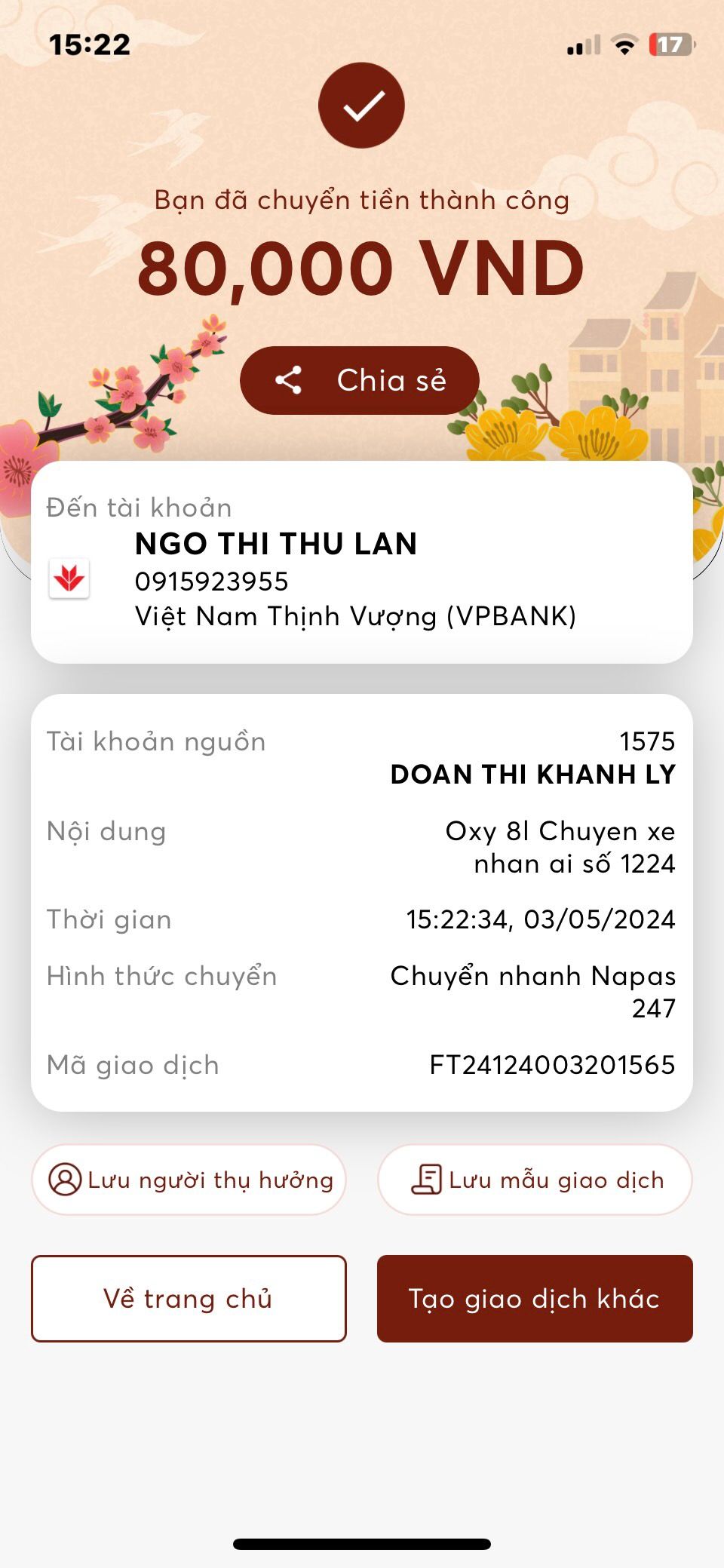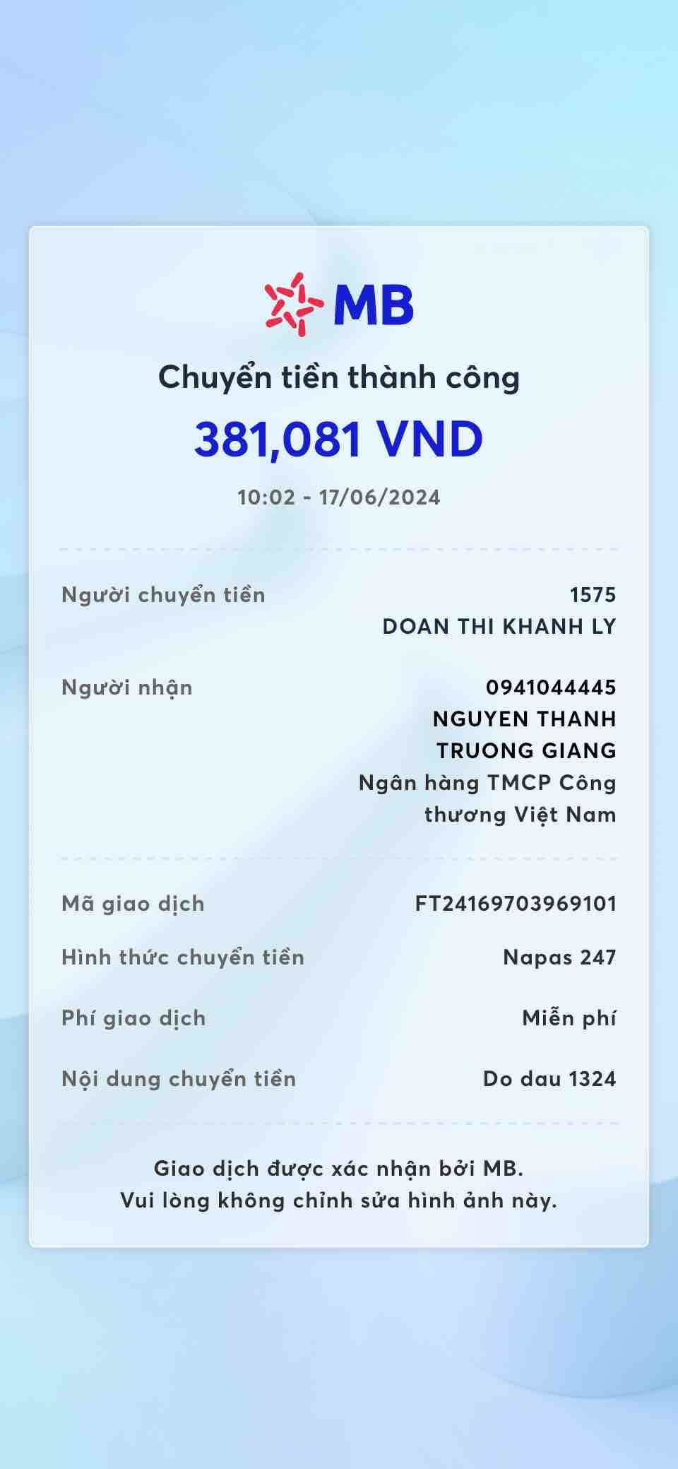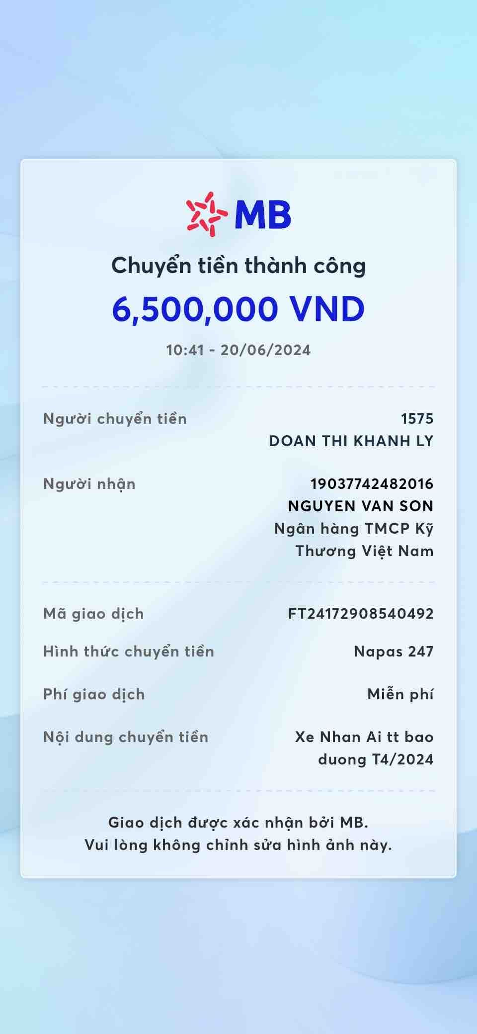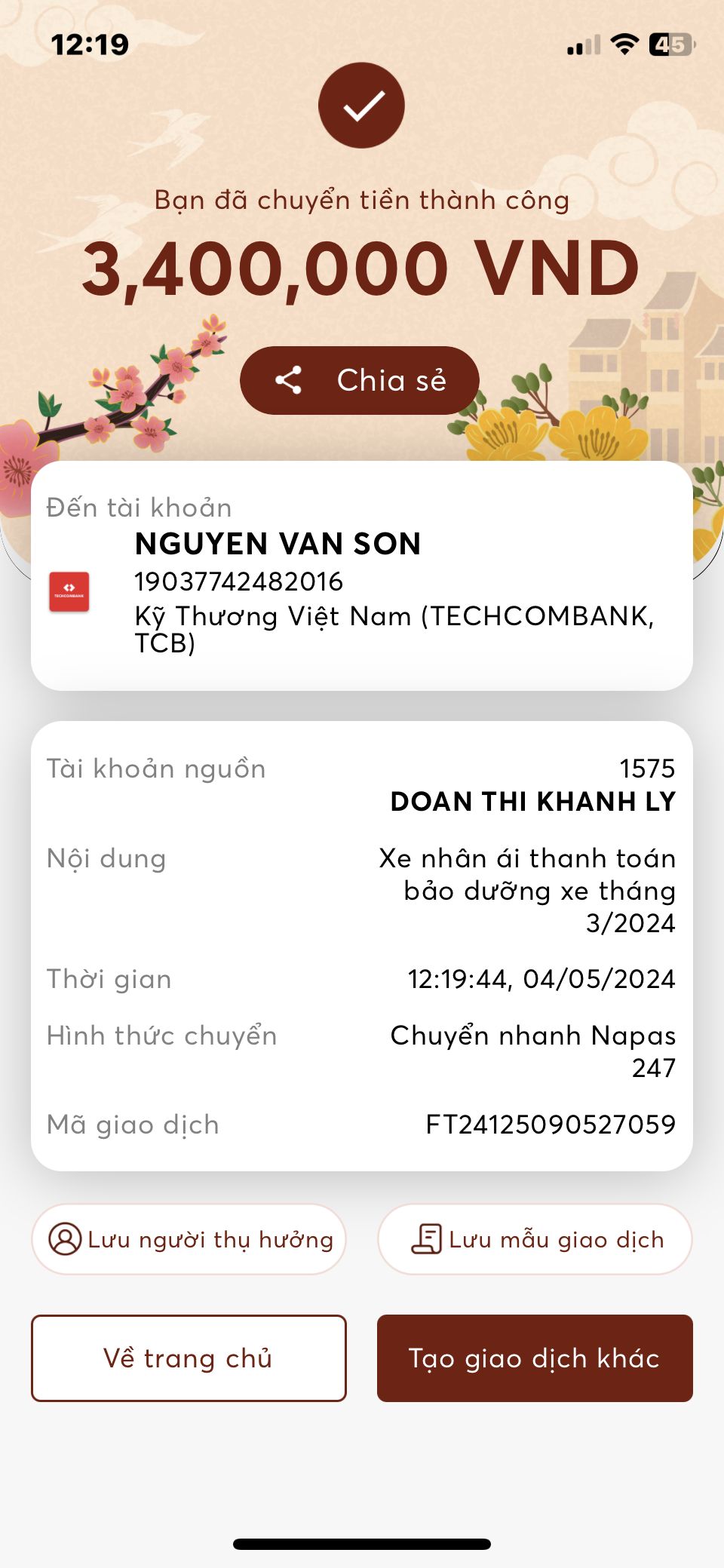 Khánh Ly đã chuyển trả gara phần bảo dưỡng sửa chữa xe tháng 3/24 theo chi tiết Giang báo cáo.