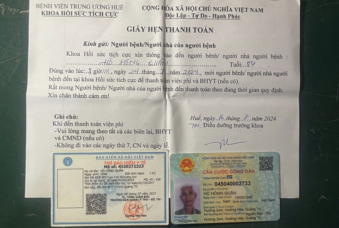 Bệnh nhân suy phổi, nhiễm trùng máu. Hộ nghèo, chuyển từ Đa Khoa Quảng Ngãi ra TW Huế, điều trị hơn tháng nay. Sáng nay hấp hối xin về. Yêu cầu xe từ khoa hồi sức tích cực, (lầu 6 TW Huế)