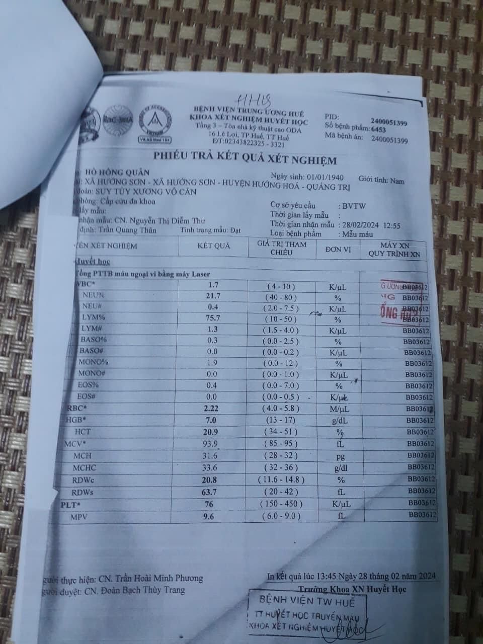 Bệnh nhân K máu lâu ngày, điều trị tại TW Huế cả năm nay, hôm nay (sẽ) bệnh mất, BV yêu cầu xe hỗ trợ. Trường hợp này nằm trong tiêu chí, đội không xác minh (Bệnh nhân K)