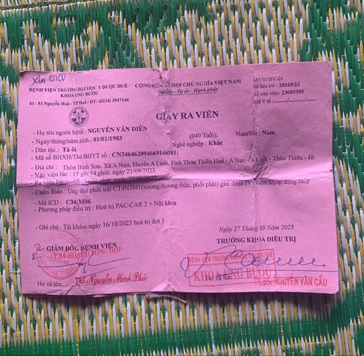 Anh đã nằm viện gần 2 năm nay rồi ạ từ bệnh viện A Lưới lại xuống bệnh viện TW Huế rồi lại từ dưới lên trên cứ như vậy rồi giờ bệnh viện đã không còn khả năng chữa bệnh với lại gia đình cũng không còn đủ điều kiện để chữa trị nữa ạ vì gia đình cũng thuộc diện hộ nghèo của thôn, xã đặc biệt rất khó khăn.