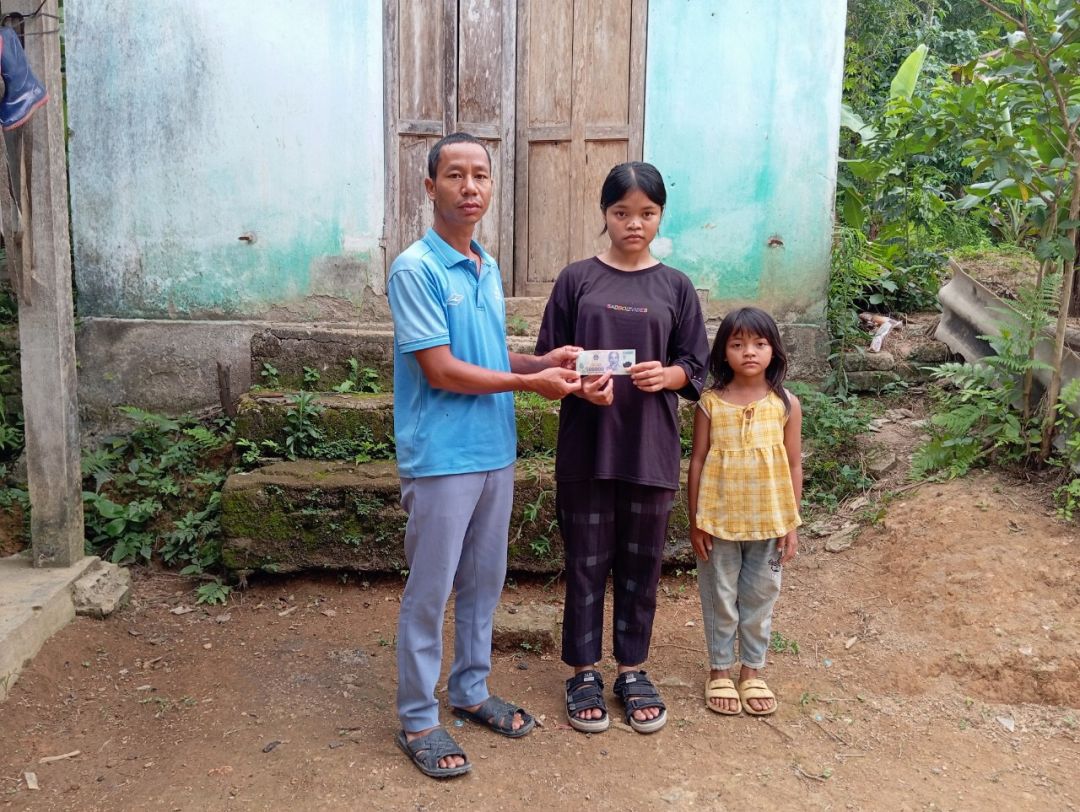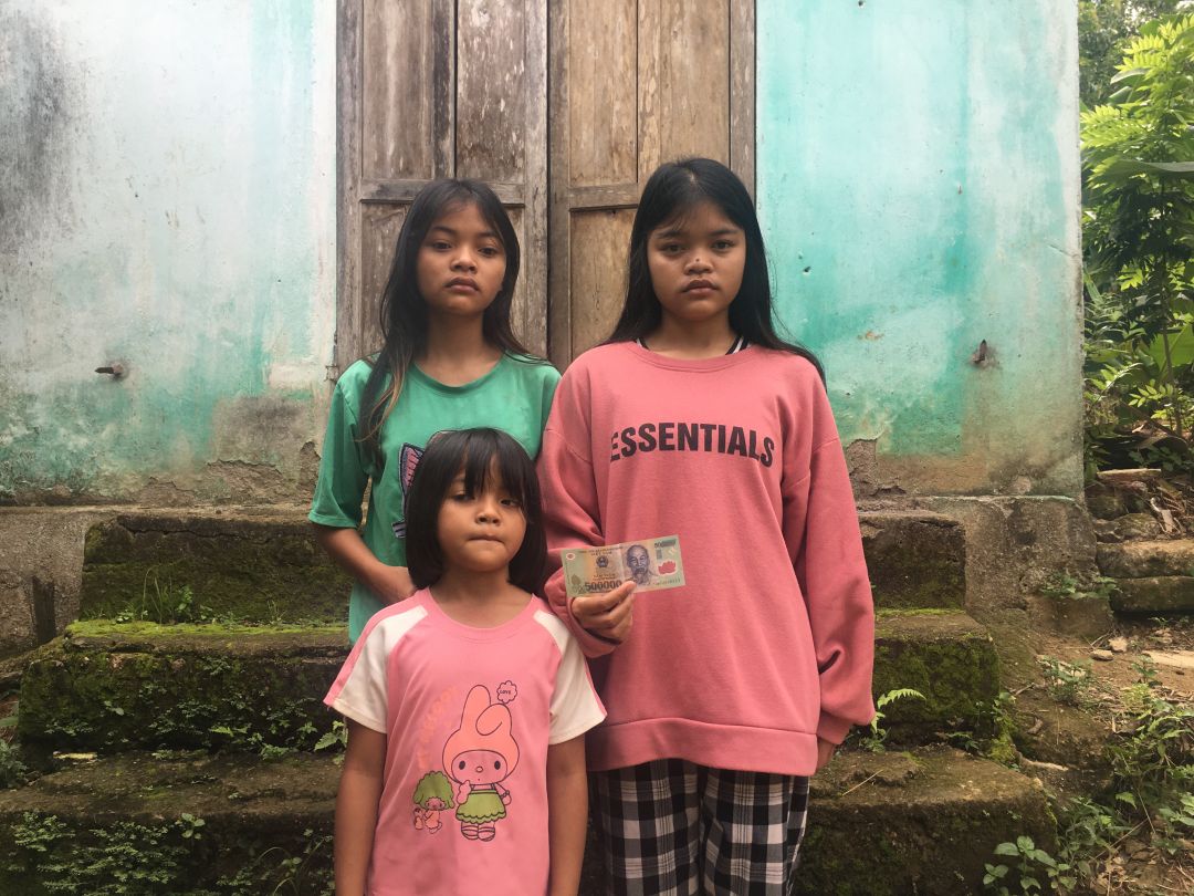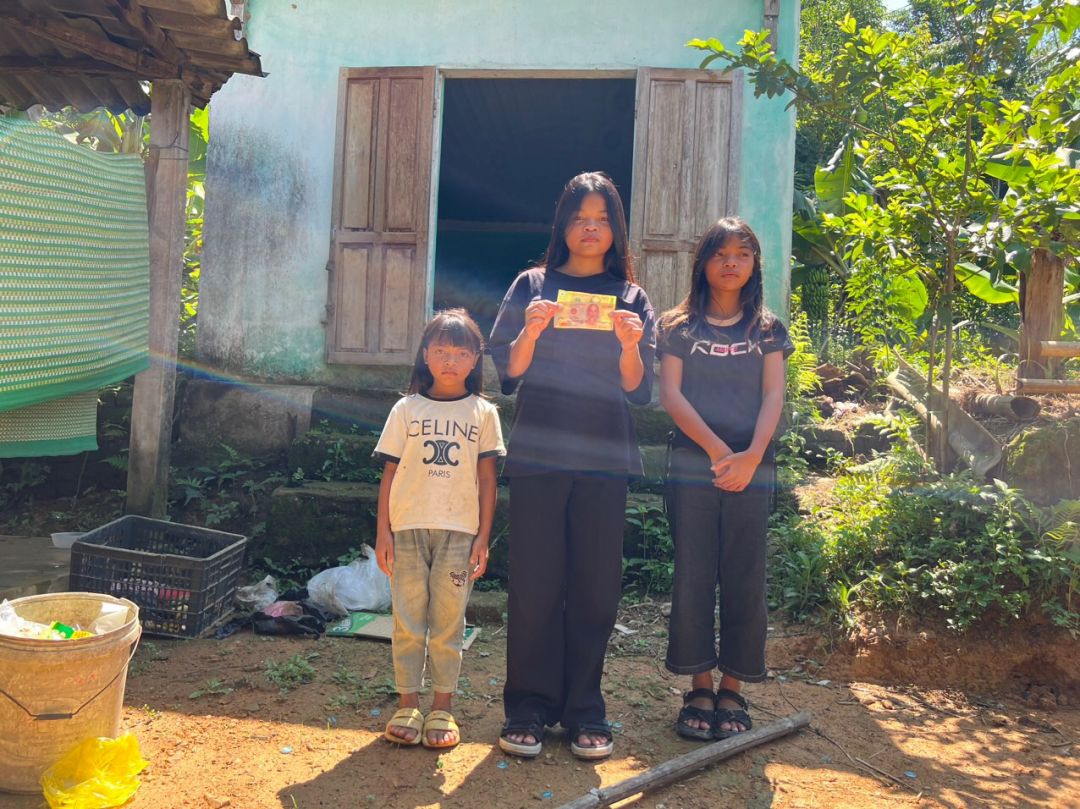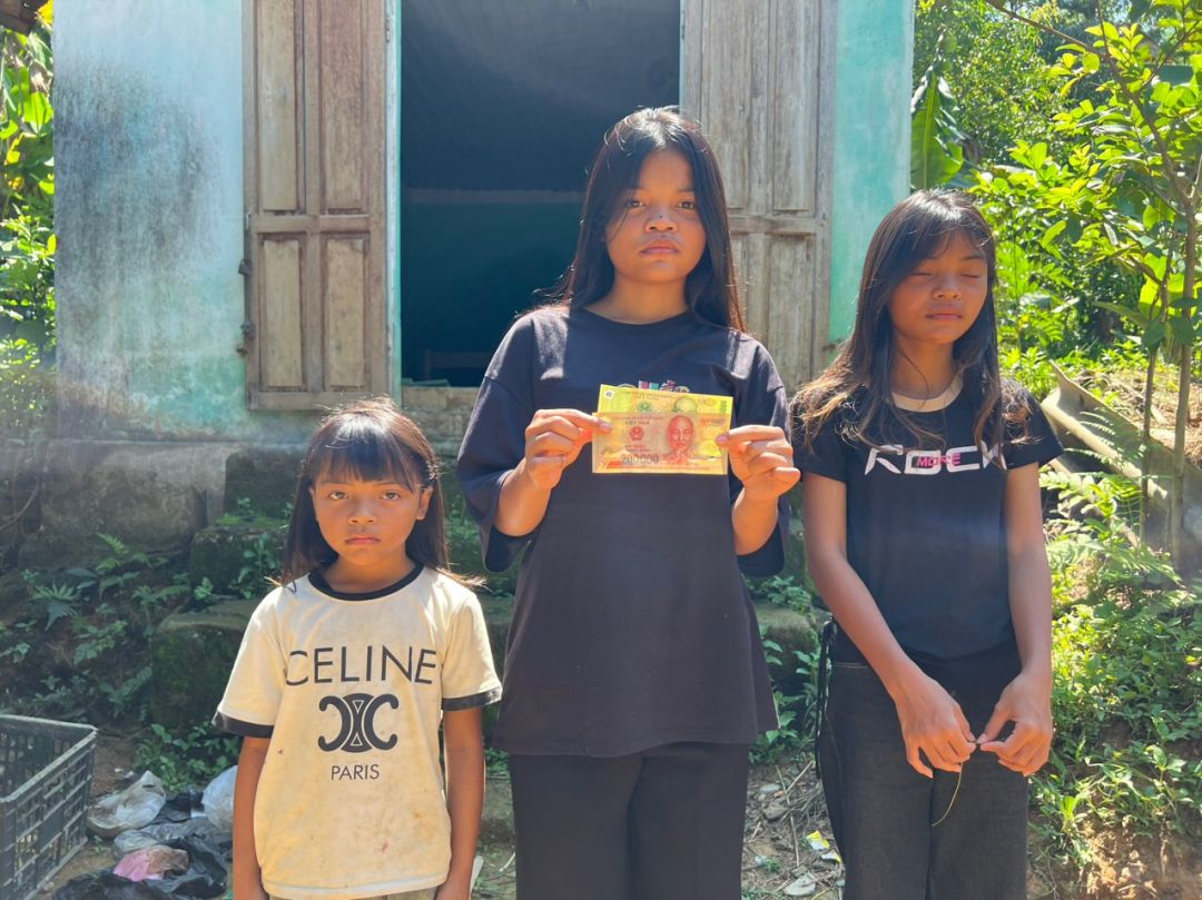 Em Pi Riu Thế đã trao số tiền 200.000 đồng của chị Trang và chị Bạch Liên cho 3 cháu của bà Kê Thị Nga tháng 5/2024.