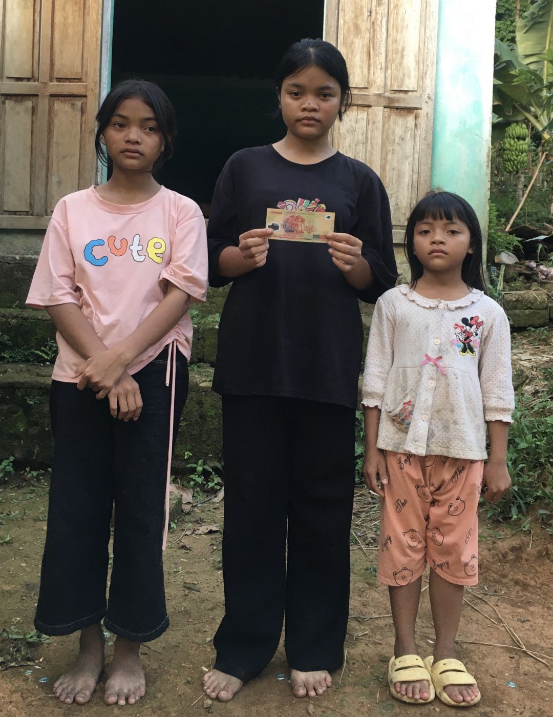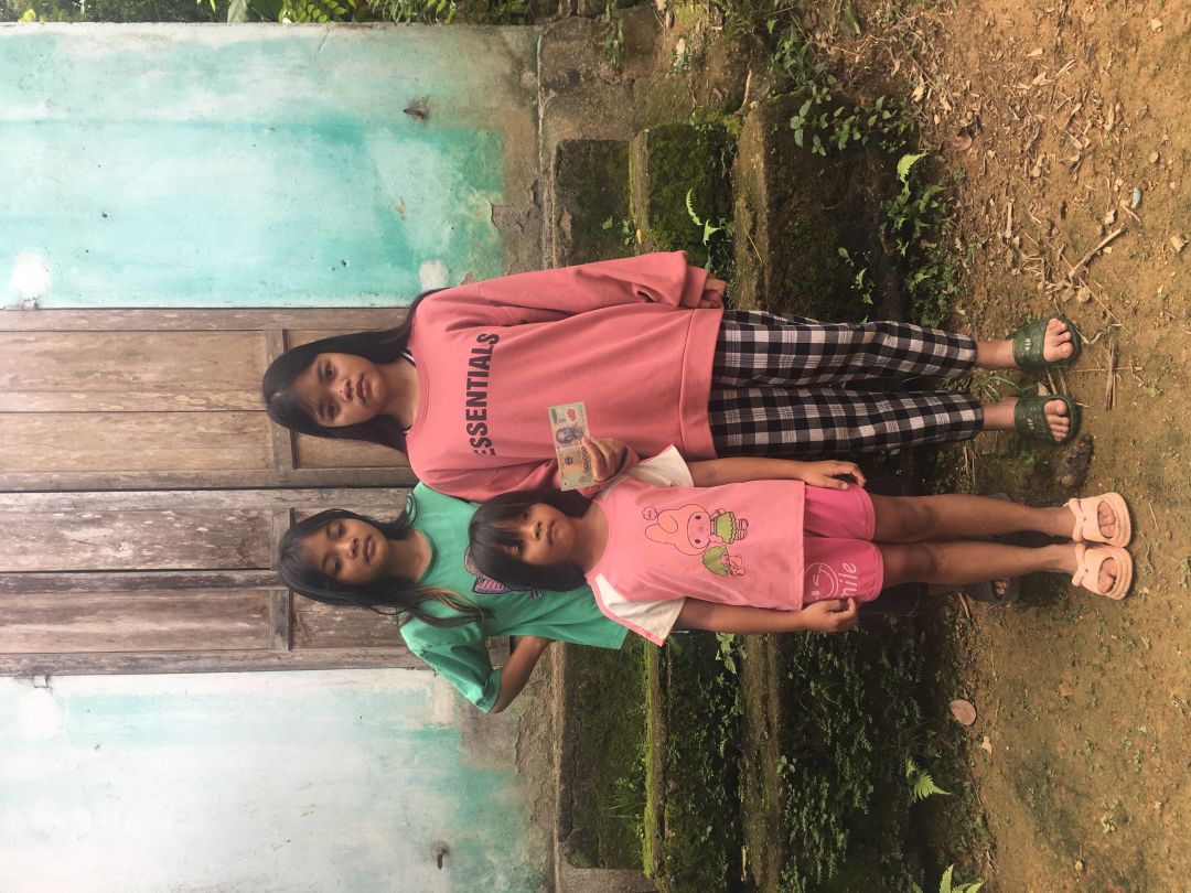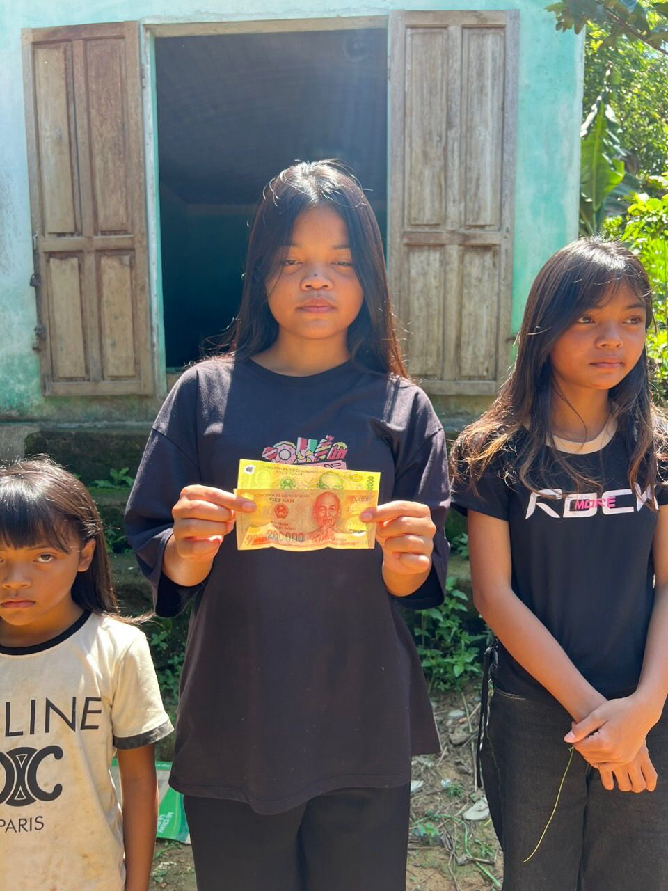Em Pi Riu Thế đã trao số tiền 200.000 đồng của chị Trang và chị Bạch Liên cho 3 cháu của bà Kê Thị Nga tháng 5/2024.