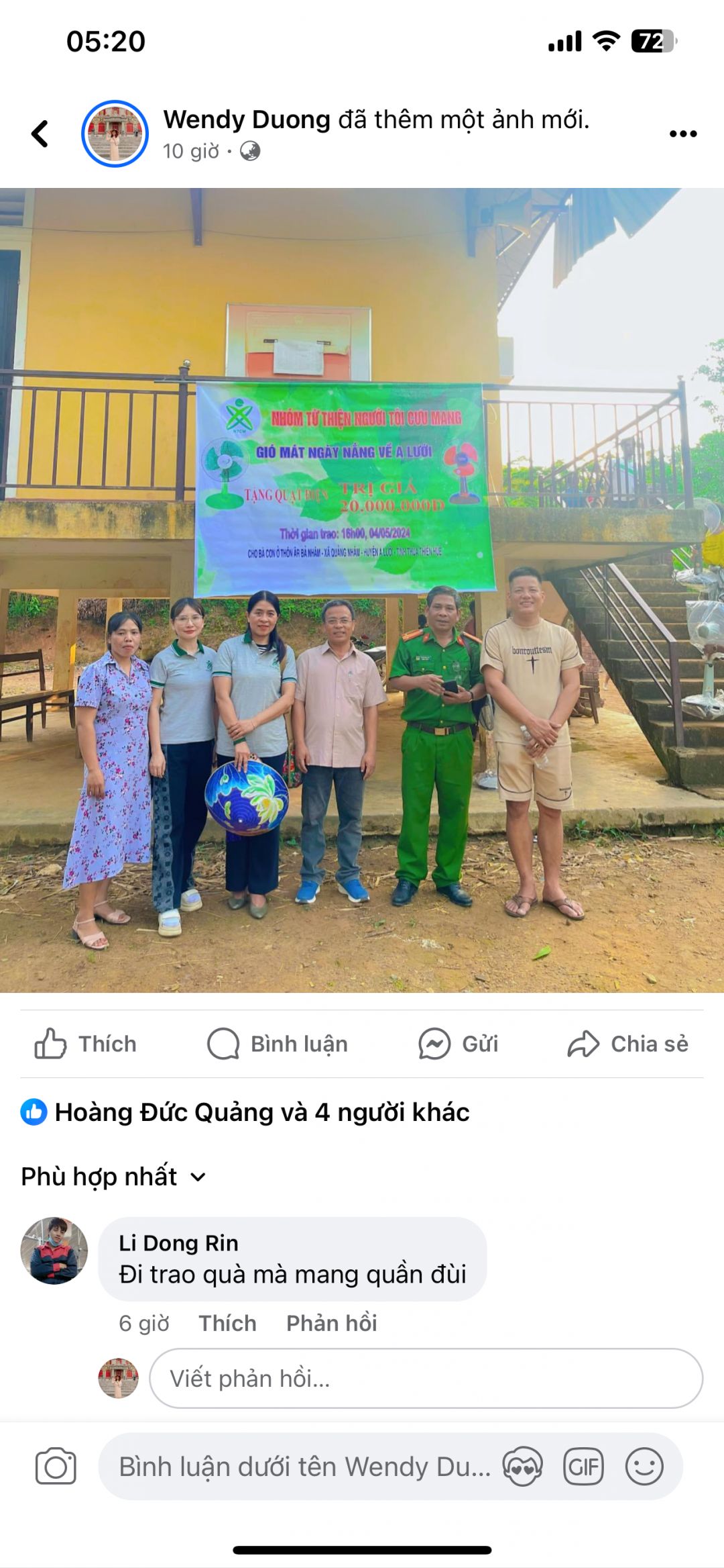 Em Wendy đại diện nhóm điều phối tại huyện A Lưới, Huế xin cập nhật thống kê tới 10h45 ngày 22/04/2024 là 12.750.000đ. Trân trọng cảm ơn sự chung tay của quý MTQ. Em rất mong nhận thêm sự giúp đỡ đủ số tiền 20.000.000đ mua quạt cho 63 hộ gia đình khó khăn ạ.