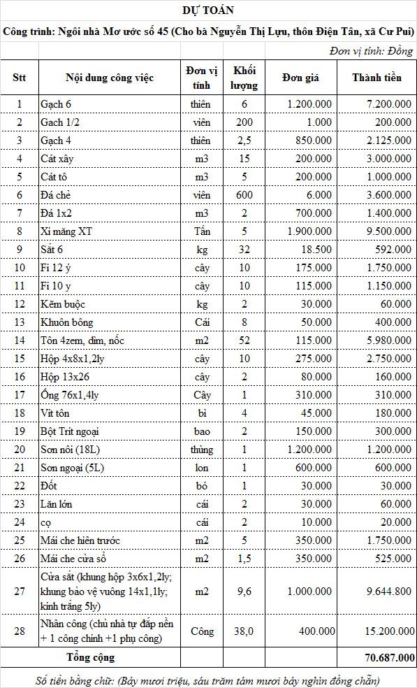 Xin phép được cập nhật bảng dự toán xây dựng là 70.687.000₫ và bản thiết kế cũng như Ban chỉ đạo xây dựng NNMU số 45.