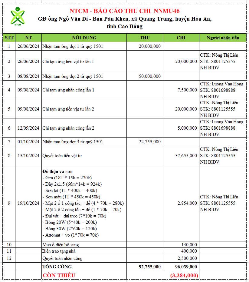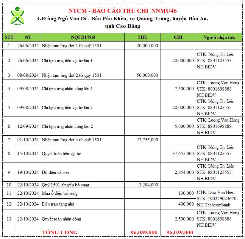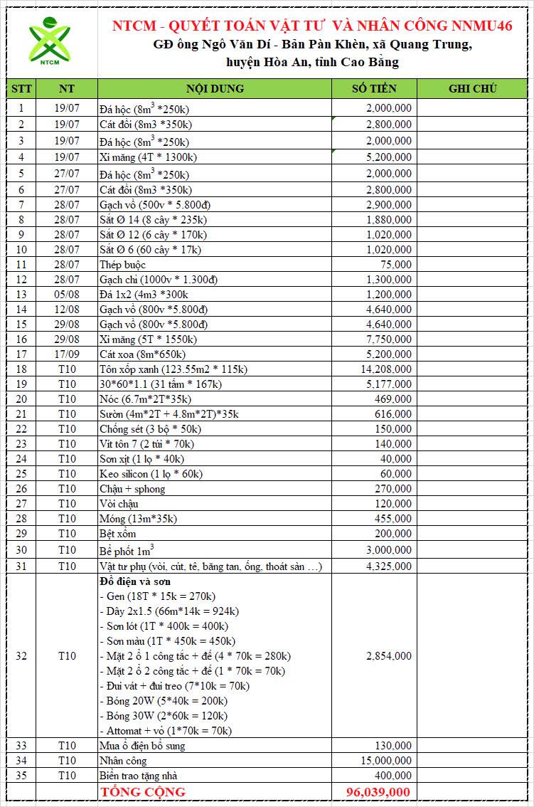 Sau gần 4 tháng thi công, NNMU46 tại bản Pàn Khèn, xã Quang Trung, huyện Hoà An, tỉnh Cao Bằng cho hộ gia đình vợ chồng chú Ngô Văn Dí cùng các con cháu đã hoàn thành trong niềm hân hoan của gia đình, bà con thôn bản và chính quyền địa phương và toàn thể thành viên NTCM.