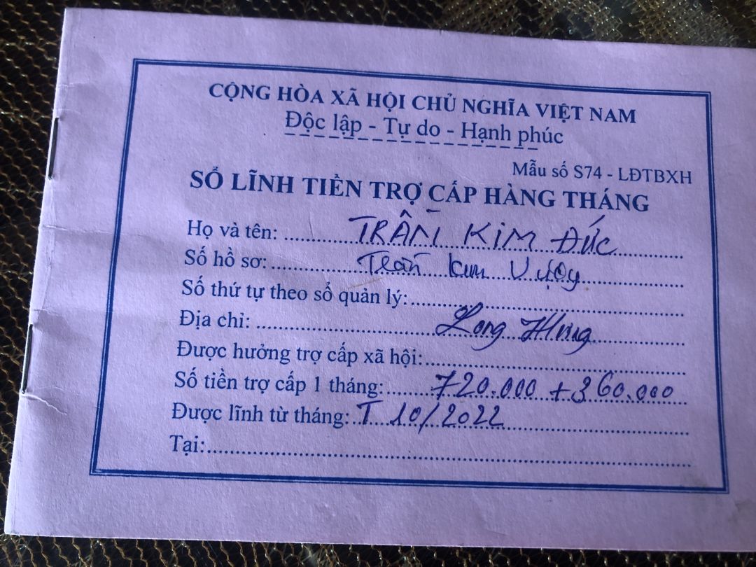 Đức thuộc diện bảo trợ của xã với mức trợ cấp 720.000đ + 360.000đ cho người chăm sóc; tổng trợ cấp được lãnh là 1080.000đ/ tháng. Số tiền này chỉ đủ 1/2 số tiền chi thường xuyên thuốc mua ngoài ngoài thuốc bảo hiểm cho bản thân Đức.