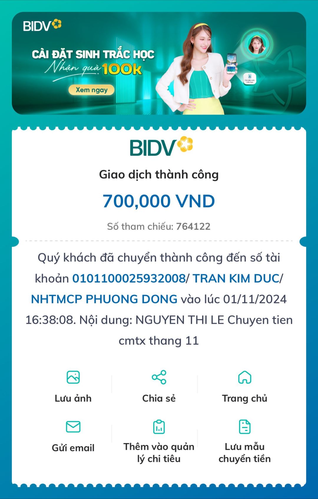 Bạn @Lệ Nguyễn đã chuyển CMTX tháng 11 cho em Đức