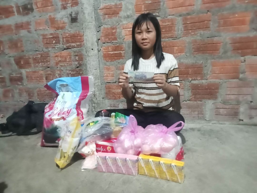 E cũng trao thêm 500.000 đ CMTX t10 nhu yếu phẩm 250.000 đ gia vị, 100.000 đ mì, 50.000 đ trứng, 50.000 đ khuyết  khô, 50.000 đ cá khô