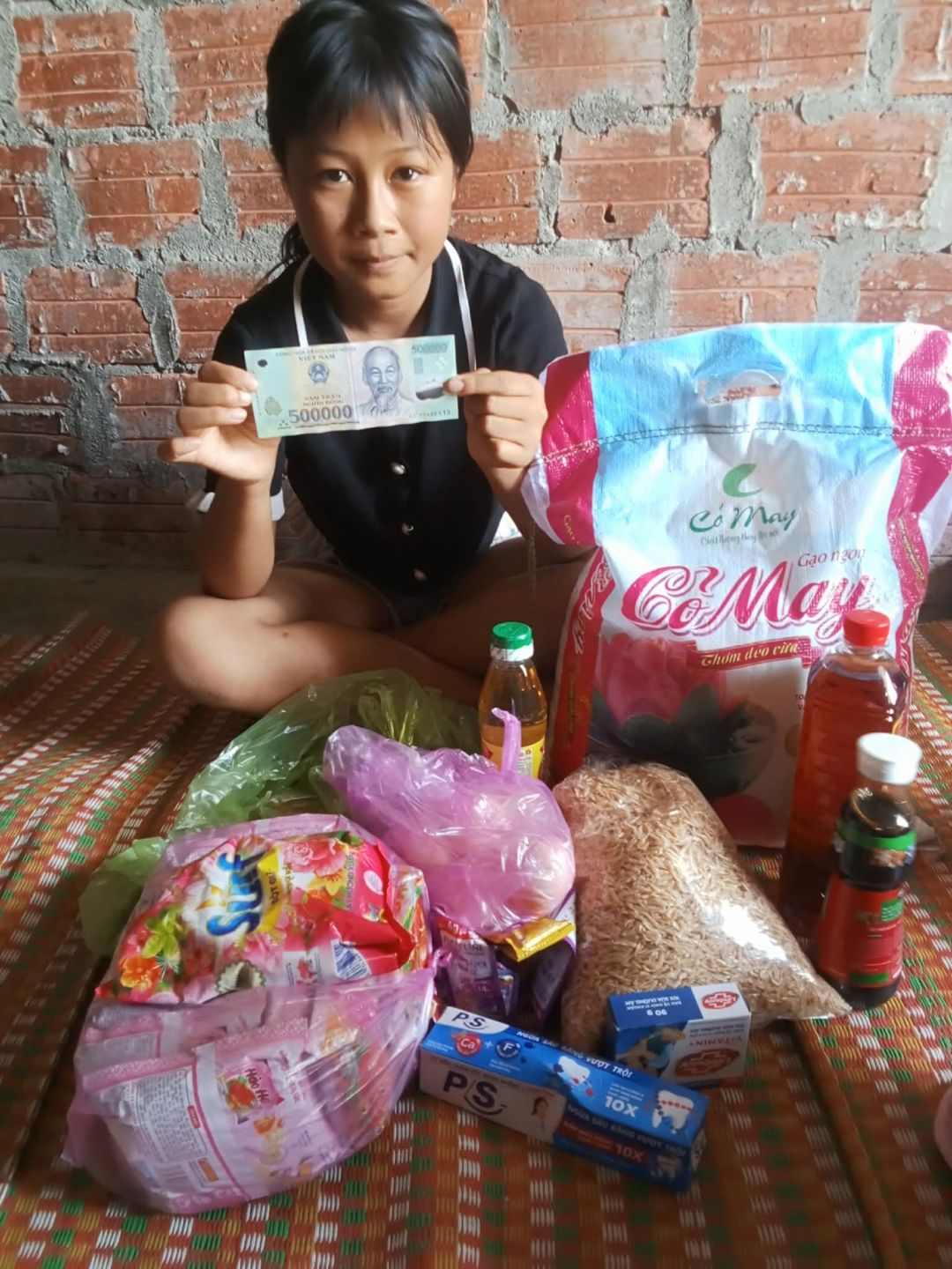 E cũng trao thêm 500.000 đ CMTX t12: 100.000 gia vị, 150.000 đ mì, 100.000 đ trứng, 75.000 đ giấy vs , 75.000 đ cá