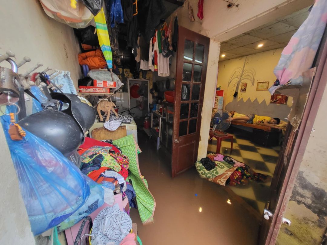 Mấy hôm trời mưa to, nước ngập vào tận trong nhà quá đầu gối, hàng xóm cho sang ngủ nhờ.