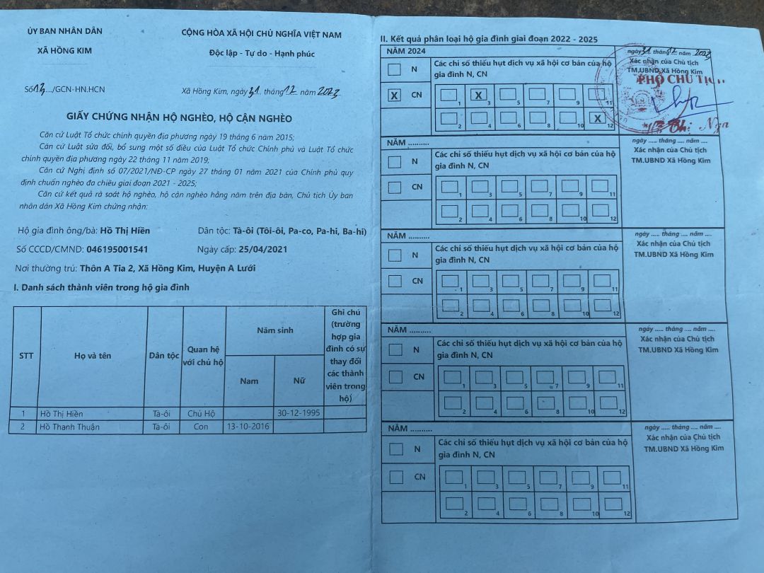 Em Hồ Thị  Hiền hiện ở thôn ATia2 xã Hồng Kim,huyện A Lưới,thừa thiên Huế. Em Hiền sinh năm 1995 lấy chồng năm 2015 và sinh được cháu Hồ Thanh Thuận sinh năm 2016. Hiện cháu Hồ Thanh Thuận đang học lớp 3/2 trường tiểu học Hồng Kim.