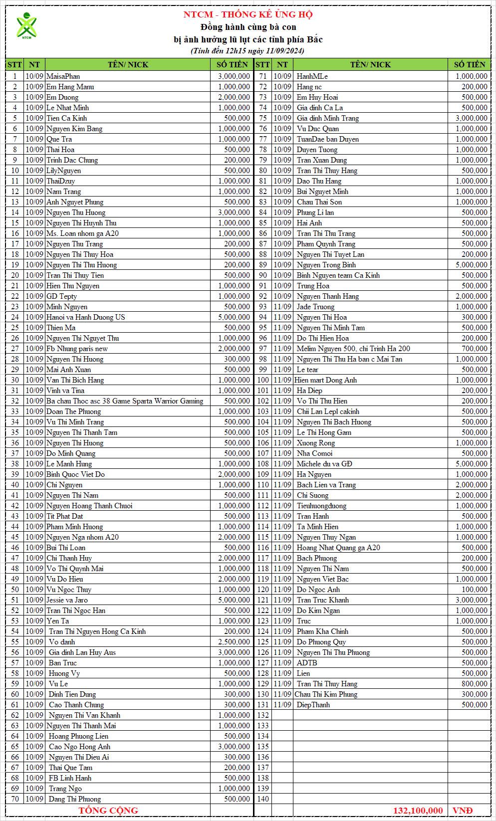 Tính đến 12h15 ngày 11/09/2024, số tiền ủng hộ là: 132.100.000đ (Một trăm ba mươi hai triệu một trăm nghìn đồng ./.)