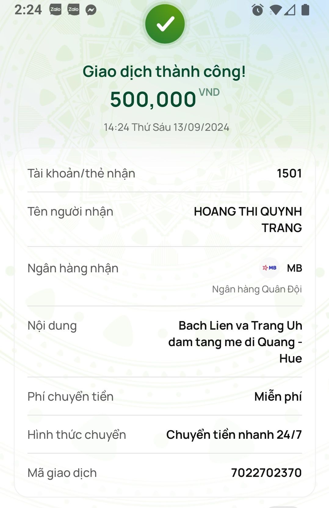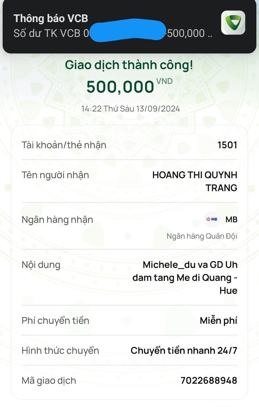 Trong đó 9.600k từ mọi người quyên góp trên các nền tảng thông tin nhóm. 1 tr thành @lacquan  (đồng thời là người đang giúp CMTX gia cảnh này) gởi qua tv trung chuyển cưu mang.
