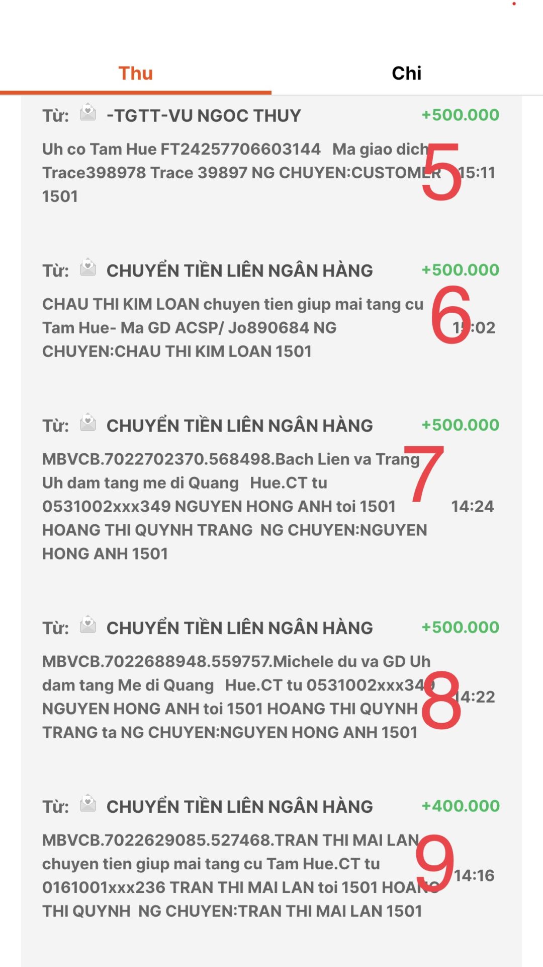 Hiện cộng nhanh đã được 9.400k Với 9 khoản chuyển khoản