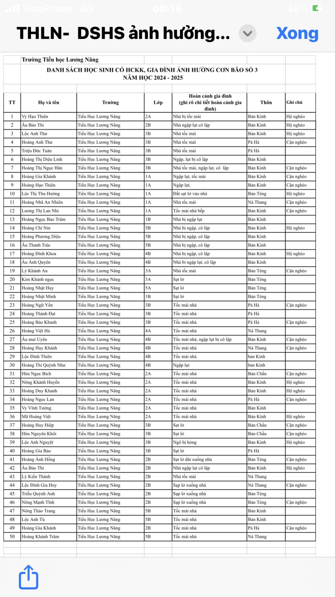 Nếu danh sách trường Tràng Phái không còn đối tượng như tiêu chí, Đội sẽ chuyển phần còn lại lên giúp những em khó khăn / hộ nghèo / cận nghèo của điểm trường cấp 1 Lương Năng có 30 em hộ nghèo và cận nghèo ảnh hưởng bão lũ (Bên dưới là danh sách các em được lập gởi phòng giáo dục huyện)