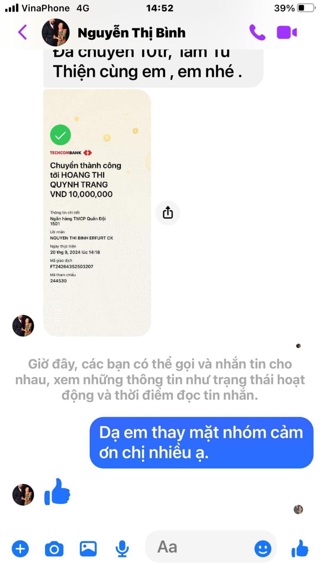 Chị Trang cũng xin được ủng hộ 1,000,000₫.