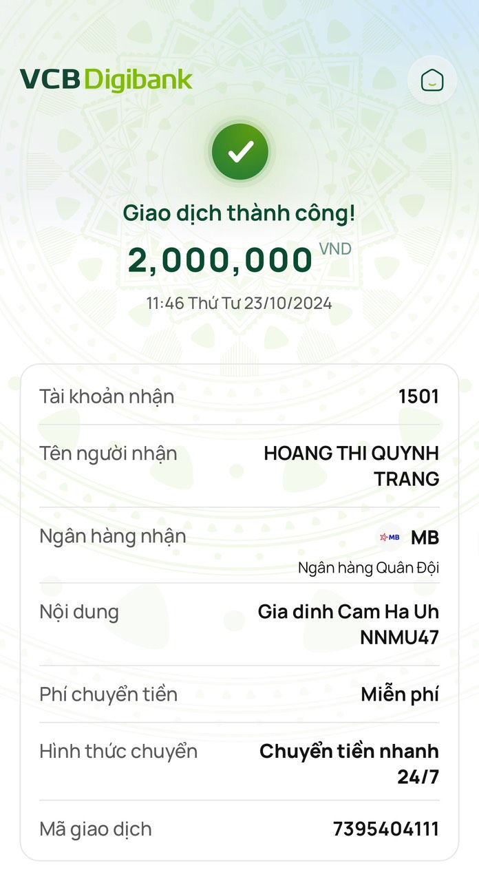 Gia đình Thanh Hà ủng hộ 2 triệu, đã chuyển khoản cho Thủ quỹ.