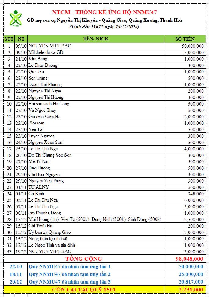 Em xin gửi thống kê ủng hộ NNMU47 đến 11h12 ngày 19/12/2024, số tiền là 98.048.000đ
