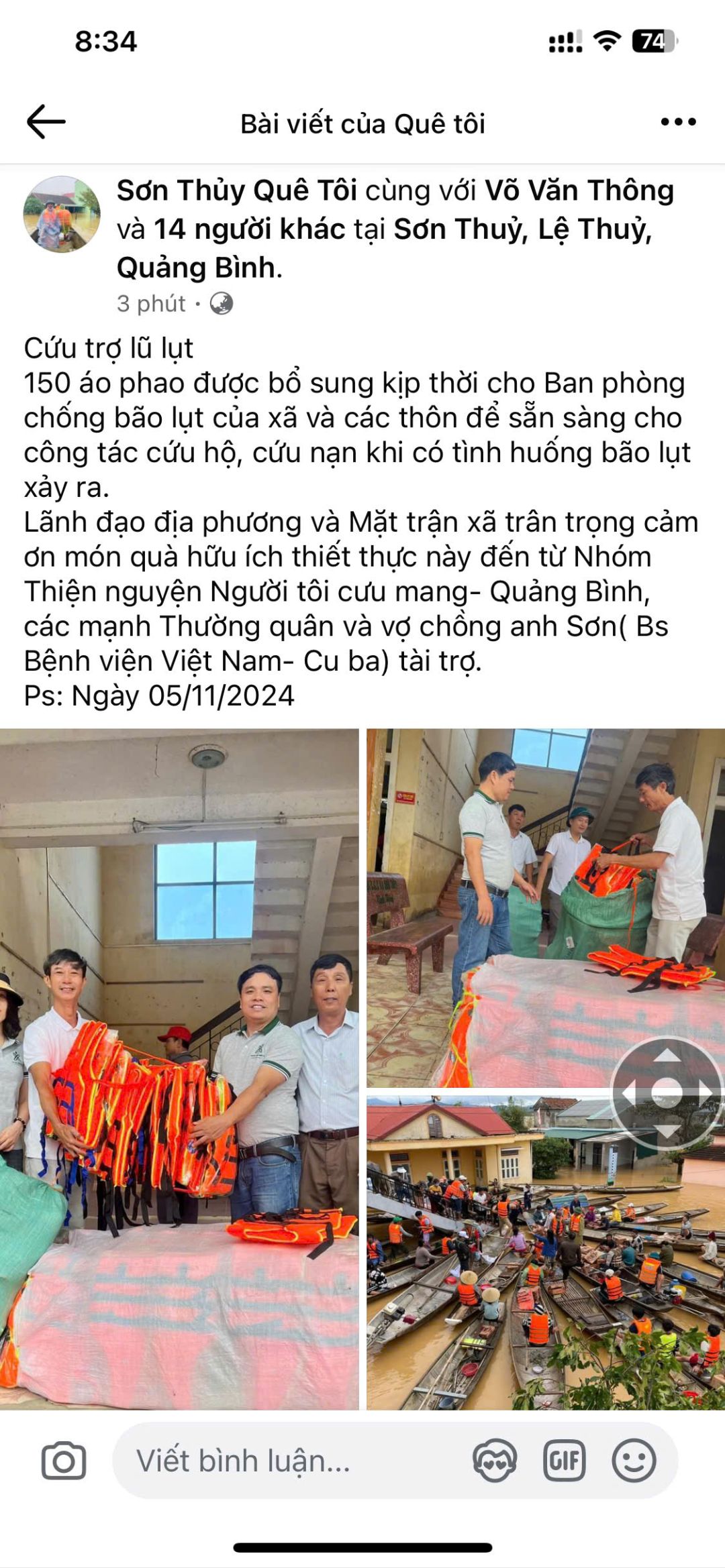 Chào cả nhà! Giang sơn xin thay mặt nhòm NTCM Quảng Bình xin tri ân và biết ơn cả nhà đã ủng hộ chương trình "hổ  trợ đồng bào vùng lũ năm 2024". Chương trình đã diển ra theo đúng như kế hoạch đã đề ra. Nhóm NTCM Quảng Bình củng không ngờ trong thời gian ngắn nhưng với tấm lòng hảo tâm, sự sẽ chia cả nhà đã ủng hộ để chương trình thực hiện trong một thời gian nhanh nhất có thể . Thay mặt nhóm NTC Quảng Bình xin trân trọng cảm ơn các mạnh thường quân, các nhà hảo tâm và toàn thể cả nhà đã có tấm lòng vàng ủng hộ bà con nhân dân vùng lũ. Lãnh đạo UBND xã Sơn Thủy, huyện Lệ thủy xin gữi lời cảm ơn đến các mạnh thường quân, các nhà hỏa tâm và toàn thể cả nhà lời tri ân sâu sắc và lời cảm ơn chân tình nhất gửi đến cả nhà. Chiều này ngày 6/11 Giang Sơn và các bạn trong nhóm NTCM Quảng Bình ddax trao 150 áo phao ( vì lý do trục trặc kỹ thuật nên hàng đến muộn không kịp trao ngày 3/11) cho cac đội xung kích cứu hộ của thôn và xã Sơn thủy để nhằm chủ động trong công tác cấp cứu, cứu hộ, cứu nạn người dần khi lũ lụt xày ra. Xin trân trọng cảm ơn.