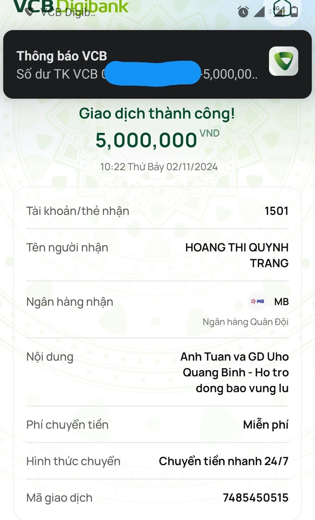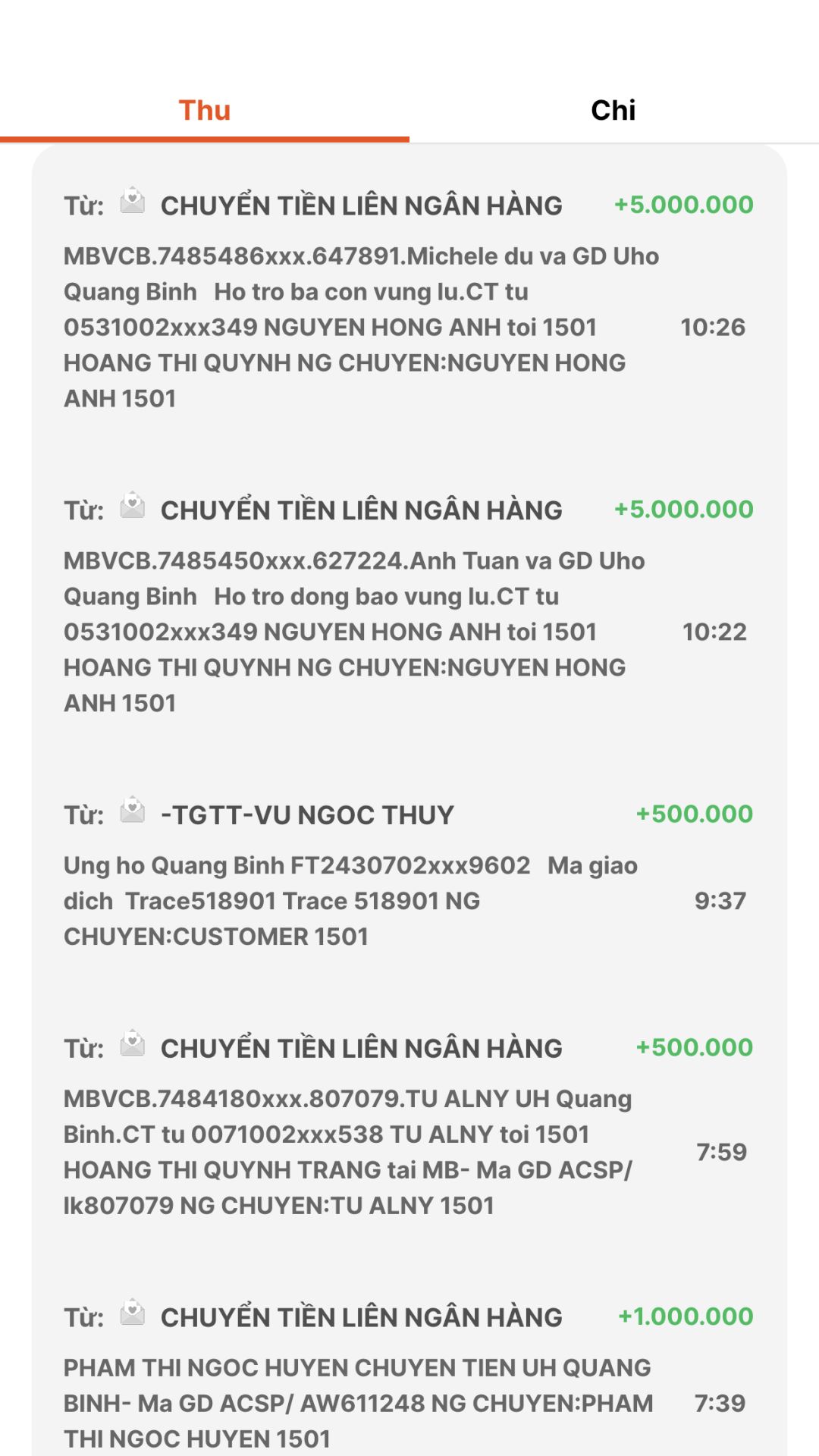 Tính đến 11h hôm nay qua tk quỹ chung 1501 MB Bank cho chương trình Quảng Bình như sau: