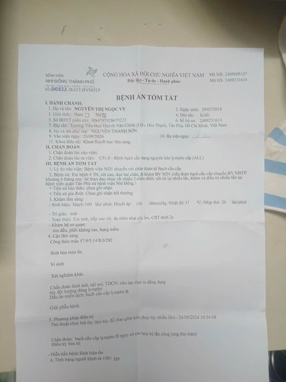 Thông qua trường của con mình là trường Huỳnh Văn Chính - quận Tân Phú, mình biết đến hoàn cảnh của cháu Vy, học sinh lớp 5/10, đang phải chiến đấu với căn bệnh ung thư máu và đang điều trị tại bệnh viện. Hoàn cảnh gia đình cháu khó khăn, đặc biệt khi cháu cần điều trị lâu dài và chi phí ngày càng tăng.