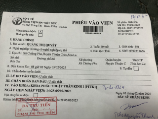 5h sáng ngày thứ 3 (15/7 ) mẹ con cháu Hương đã tới Bv Việt Đức, đã khám ở ngoài phòng khám, bác sỹ có nói: "nếu đồng ý Mổ thì mới nhập viện. Nếu không đồng ý thì bsy kê thuốc để về mua uống thôi ". Bsy không cho làm các xét nghiệm lại ( vì sáng 14/7 cháu Hương đã khám, làm các xét nghiệm chiếu chụp tại Bv tỉnh Sơn La; Bsy ở VĐ chỉ cần xem các kết quả ở Bv SL thôi ).