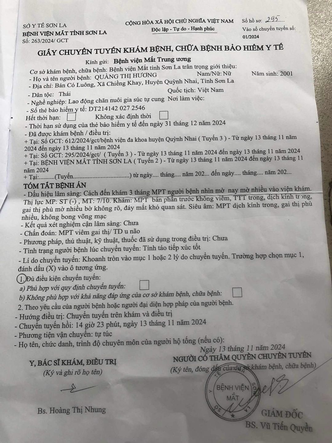 Sau khi cháu sinh con đầu lòng ( 2019 ) thì bắt đầu sk kém dần, thoái hóa lưng, đau chân ... và sau khi sinh cháu thứ 2 (2021 ) thì càng yếu hơn, không đi làm nương được nhiều và ngày càng sinh ra các bệnh khác như: đau đầu, thỉnh thoảng co giật và ngã, đau và mờ mắt, một bên gần như ko nhìn thấy gì, và 1 bên mờ nhiều.