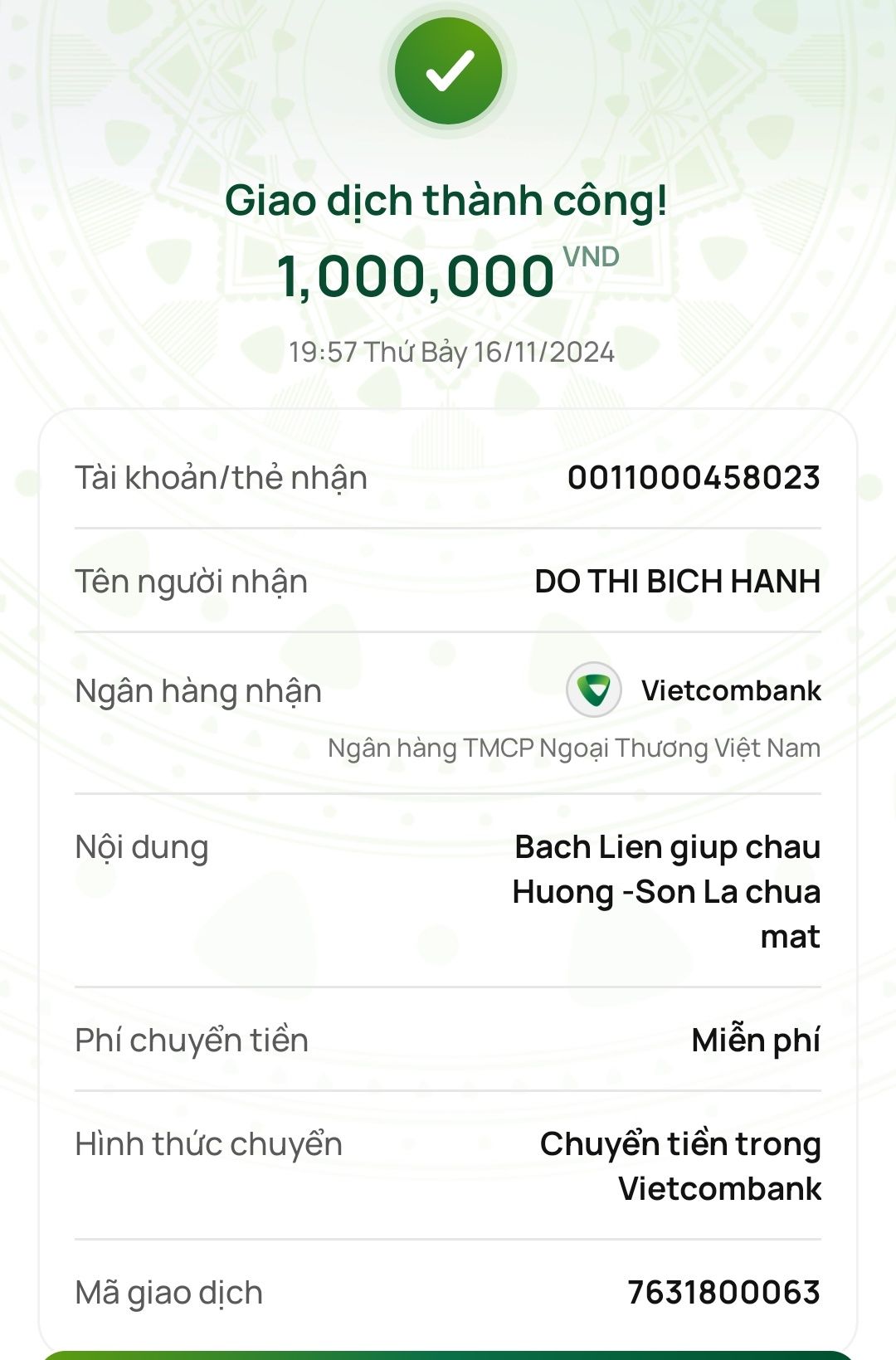 6x đã chuyển 1,000,000₫ Bạch Liên ủng hộ cháu Hương khám và chữa mắt tới @haybanglong rồi nhé.