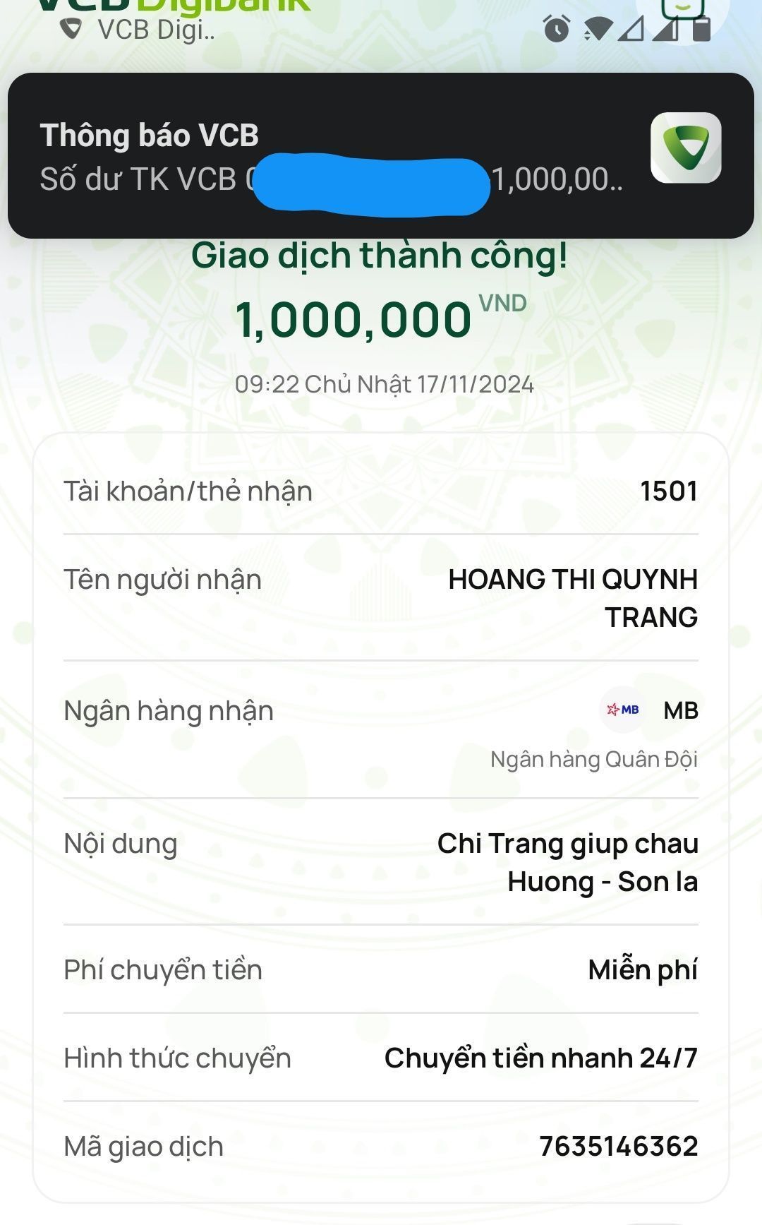 Tối qua HBL đã nhận được 6tr từ Diễn đàn gửi tới giúp cháu Hương.