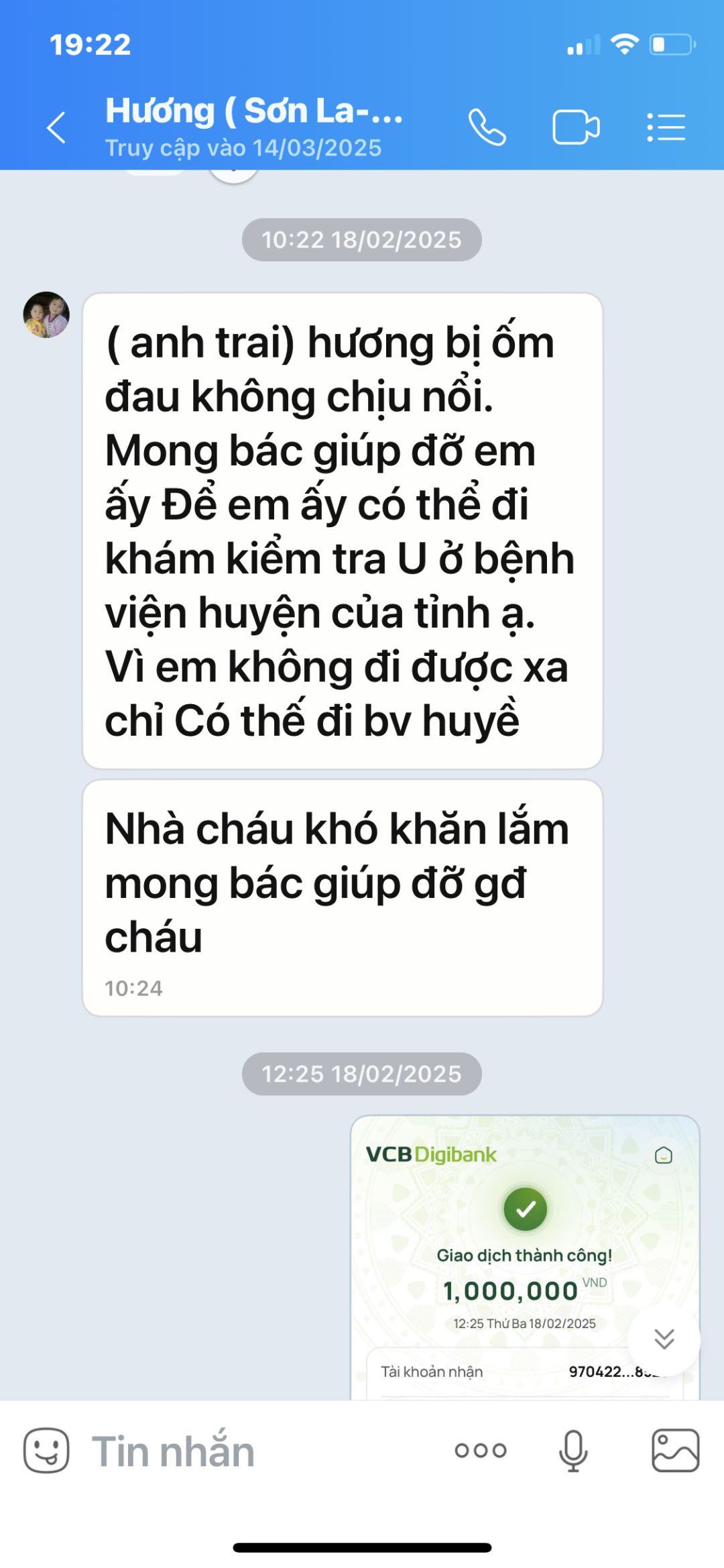 Ngày 13/5/2025, cháu Hương lại nhắn tin xin hỗ trợ CP đi tái khám ( cứ 1 tháng cháu đâu và sốt ruột nên lại tái khám ). Ngày 19/5 HBL đã ck vào TK cháu Hương 1.000k