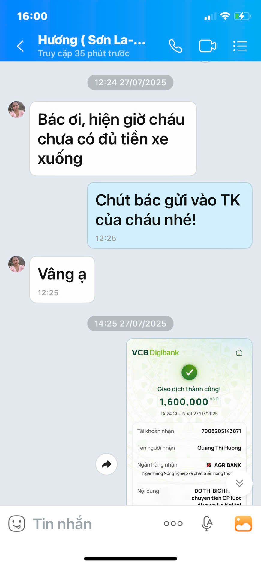 Sau khi nhận được tin nhắn ngày 14/3 của cháu Hương nhờ giúp tiền đi tái khám, thì ngày 16/3 HBL đã ck tới mẹ cháu Hương 1.000k.