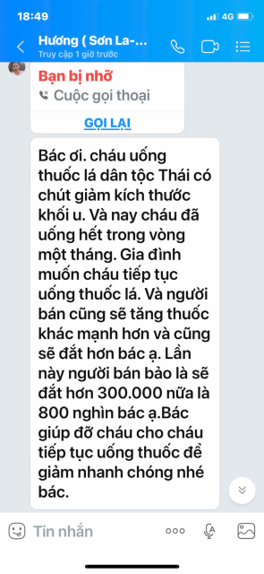 Ngày 1/11/2025, sau khi uống hết thuốc Nam do HBL mua ở Vĩnh Phúc thì cháu xin được tạm dừng để uống thuốc LÁ do người dân tộc vùng cháu bán.